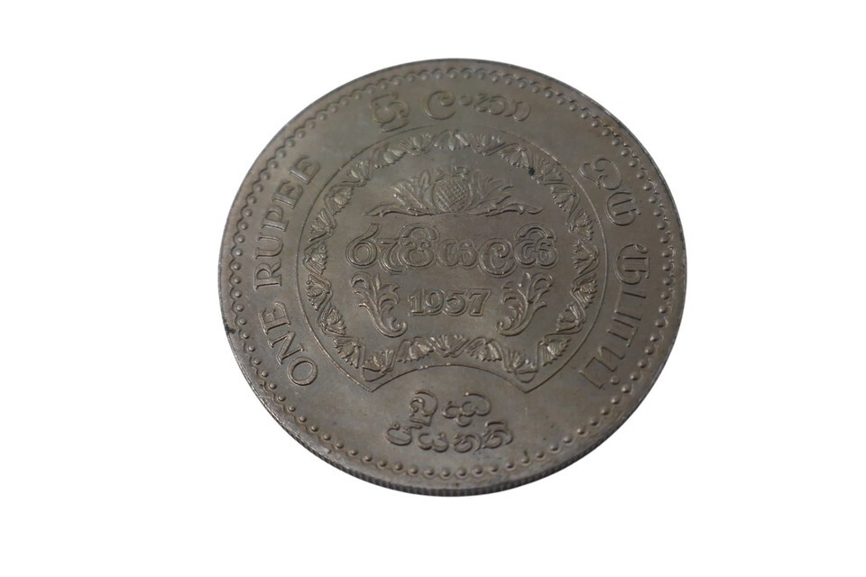This is a 1957 Ceylon 1 Rupee coin celebrating the 2500th anniversary of Buddhism. Made of copper-nickel, this commemorative coin was issued in Sri Lanka.