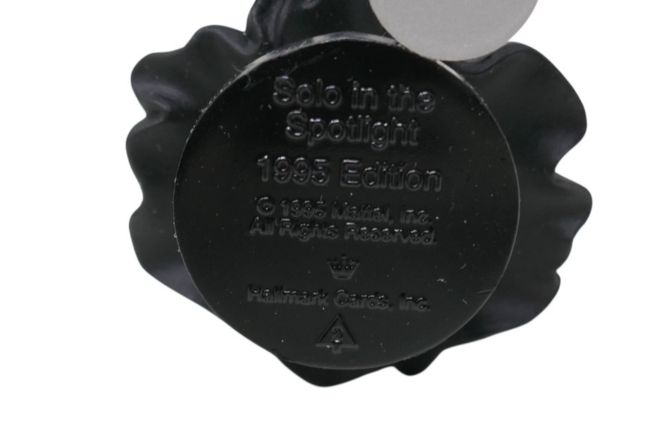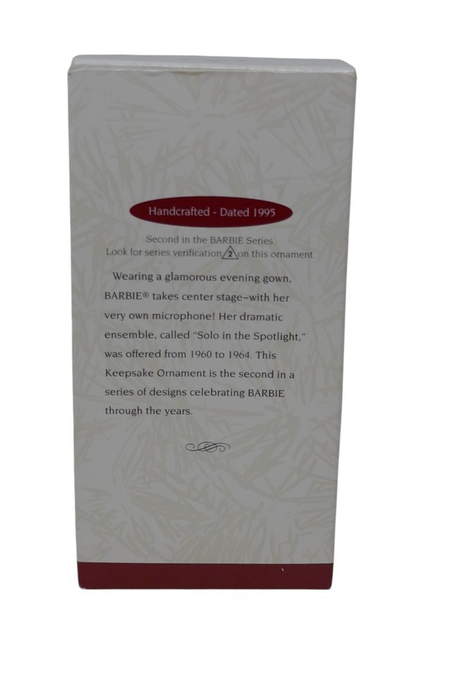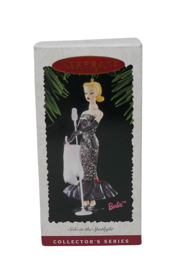 The Hallmark Keepsake 1995 Barbie Solo in the Spotlight Collector's Series Ornament is a vintage Barbie doll ornament standing at 4.5 inches tall, with blonde hair and black eyes. Has minimal wear and comes in the original box.