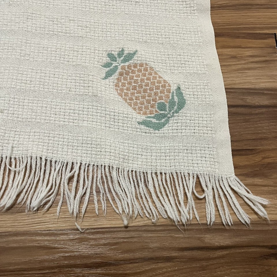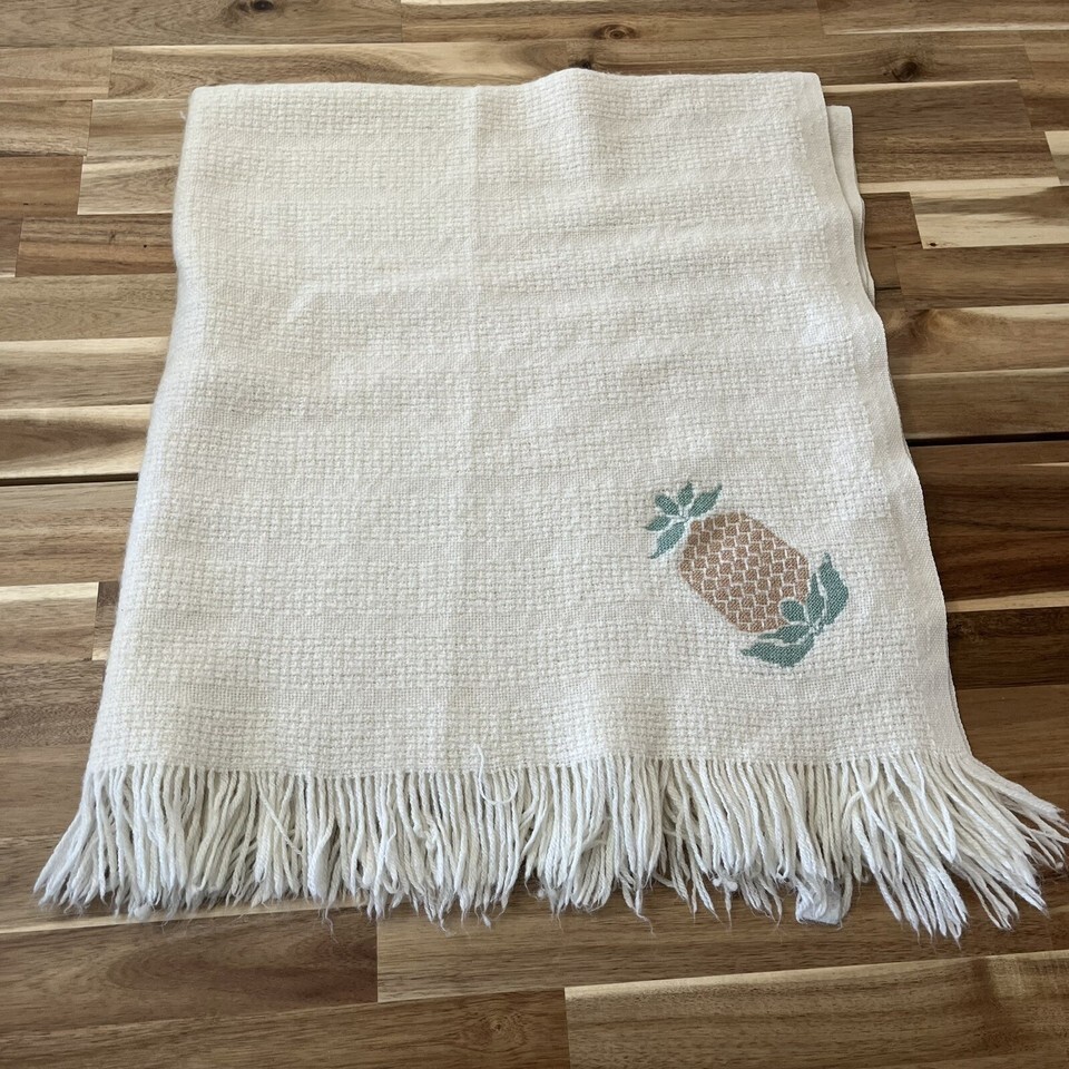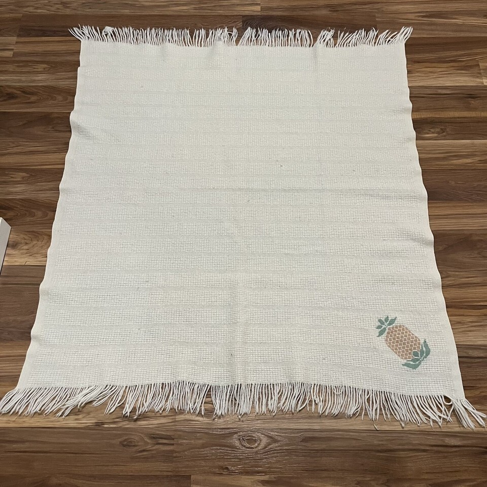 Vintage Faribo Wool Blend Cream Fringe Throw Blanket With Pineapple Accent 44x51