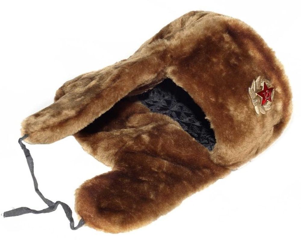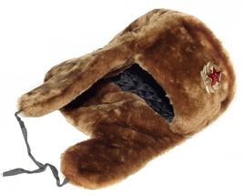 This camel brown color fur hat with ear flaps is a traditional Soviet Army winter hat - warm and cozy, perfect for protecting from Siberian winds and snow storms. It is made of faux fur. This kind of fur has been designed in the Soviet Union specifically for such winter army hats. It is known for its durability and resistance to snow/water. This model is available in sizes M, L, and XL. It has a nice quilted lining. Each hat is supplied with a detachable Soviet double headed eagle badge. Should it be necessary, the badge easily comes off leaving no marks on the fur. They may be worn ear flaps up or down Materials used are 37% pan, 30% wool, 15% cotton, 13% flax fiber, 5% other fibers. When you wish to wash the hat it should be dry cleaned only. The chart is the same for woman as well.