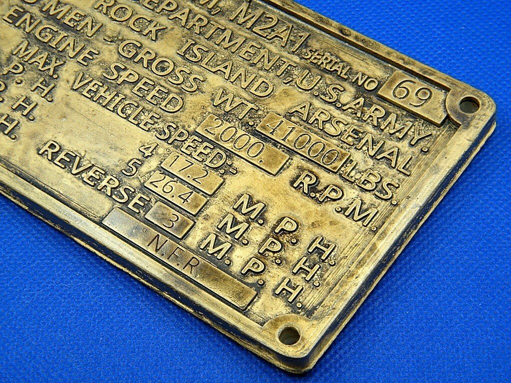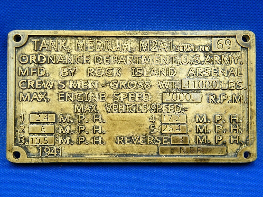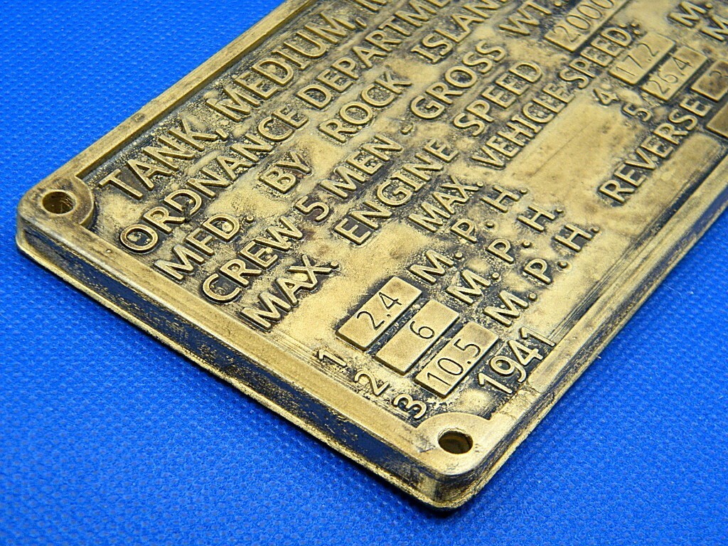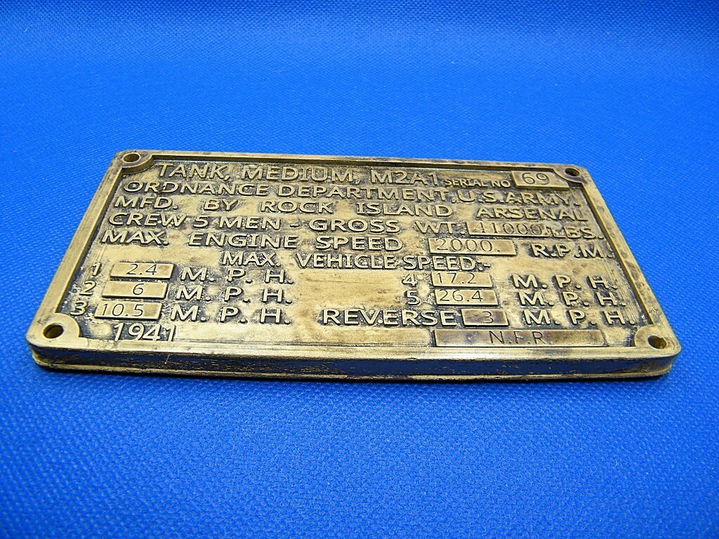 WWII US Army M2A1 Medium Tank Builders Plate / ID plate - resin reproduction
