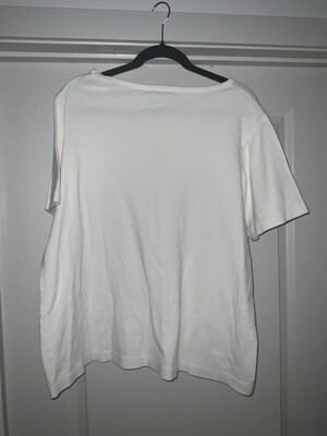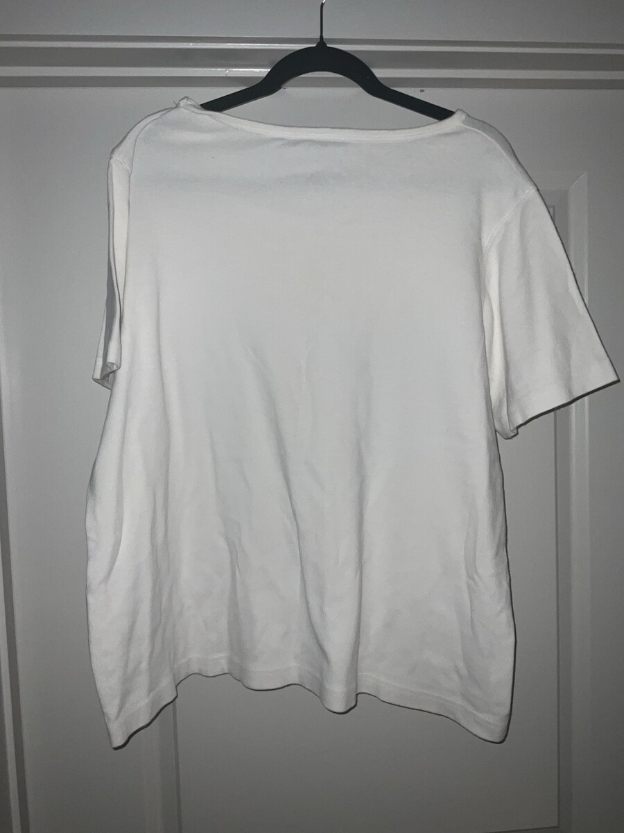 The product is a women's Erika and Co. white and green palm tree shirt top in size 2XL. This casual knit top features a solid white color with short sleeves. The design includes a palm tree pattern, making it a stylish and comfortable choice for women who wear plus sizes. Pit to pit 26 inches length-26 1/2 inches
