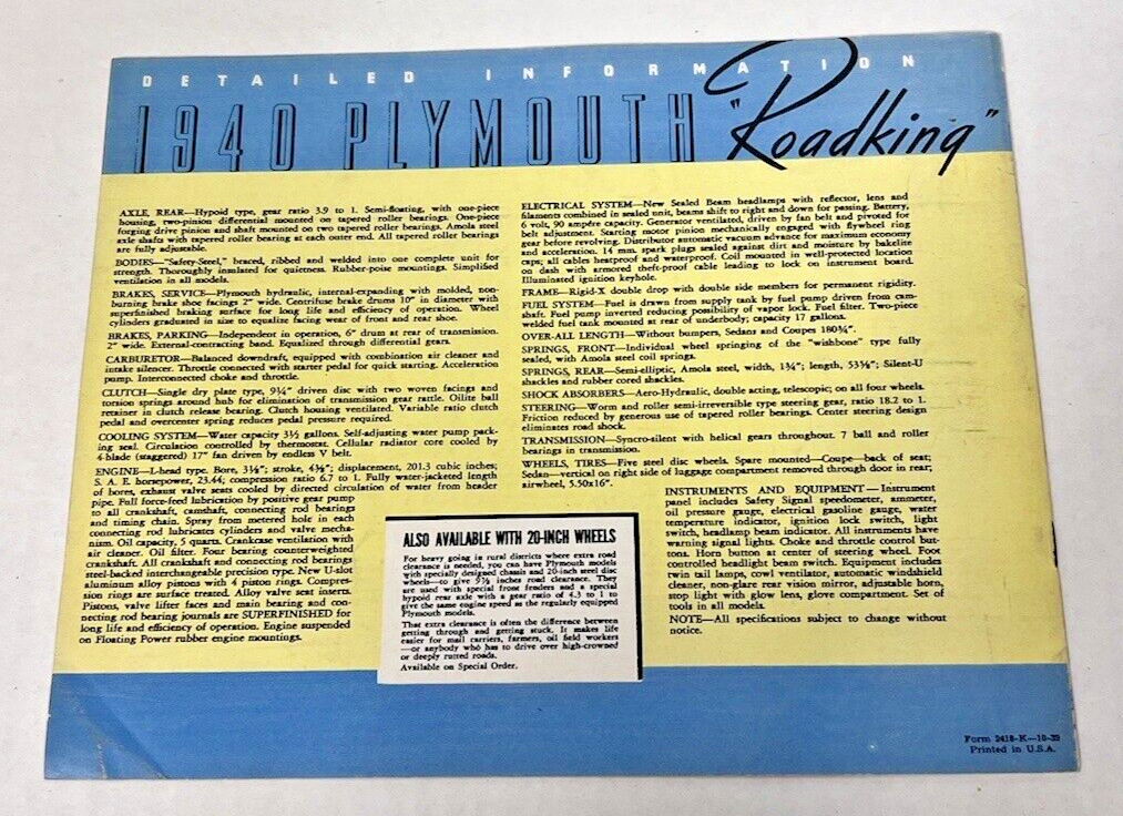1940 Plymouth Roadking Luxury Ride Original Color Brochure 14 pages added to cart.