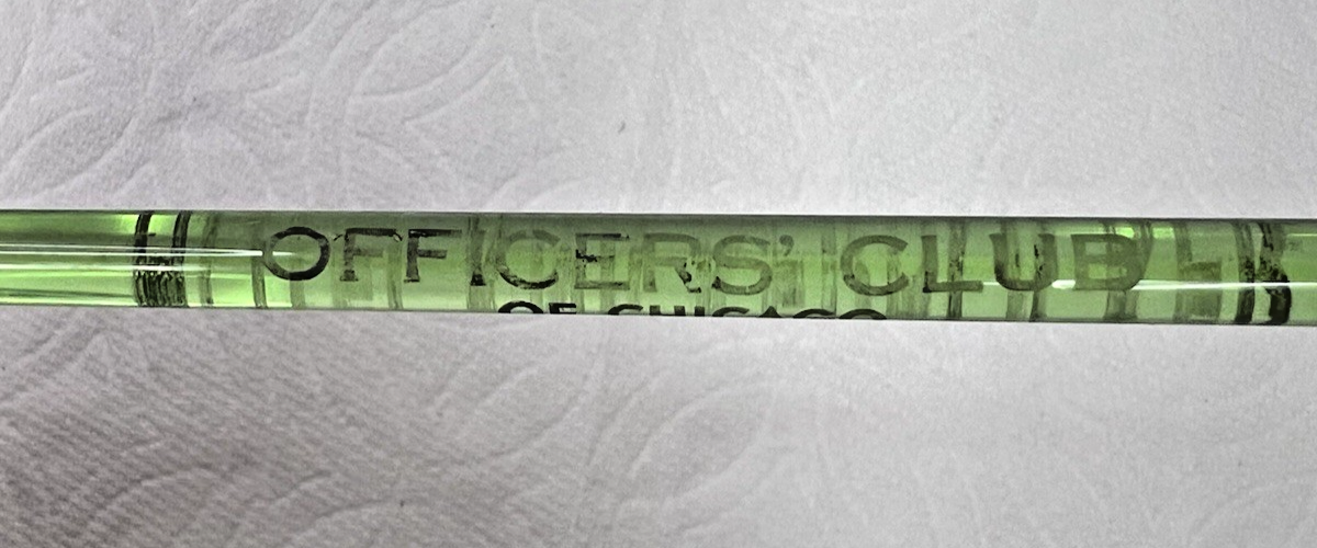 Antique Hotel Knickerbocker Chicago Officers Club Light Green Glass Swizzle Stick 6" In good shape but man the lettering is impossible to get a photo of
