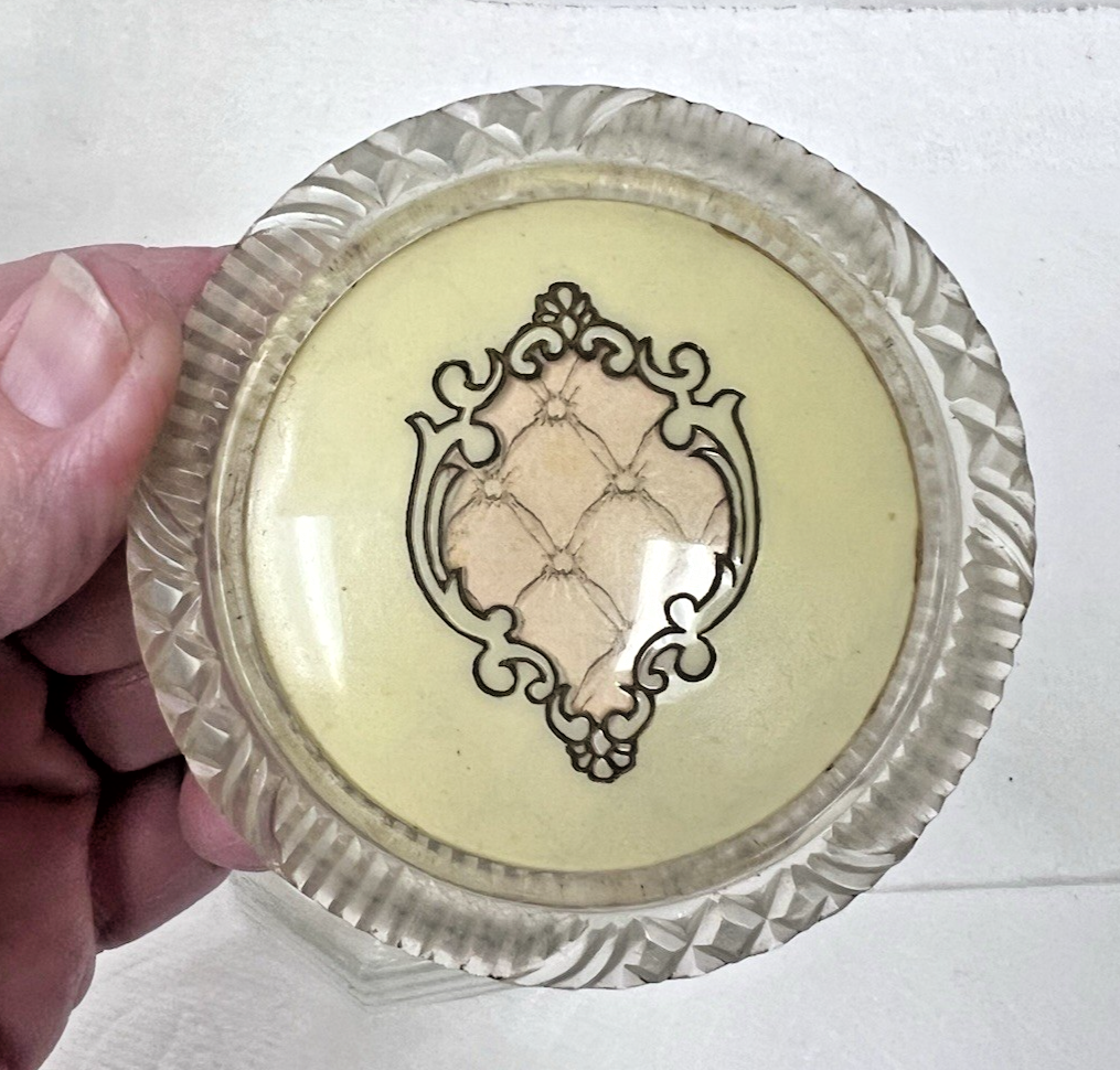 Vintage Vanity Jar Glass Base Pard Plastic Fancy Lid Pink Yellow The lid is 2 3/4 wide and the jar is 2 1/2 inches