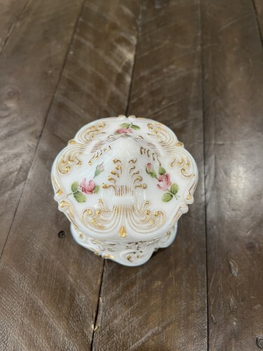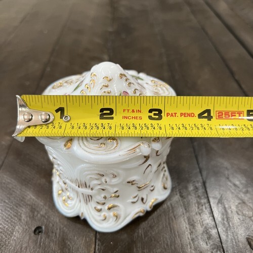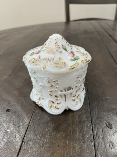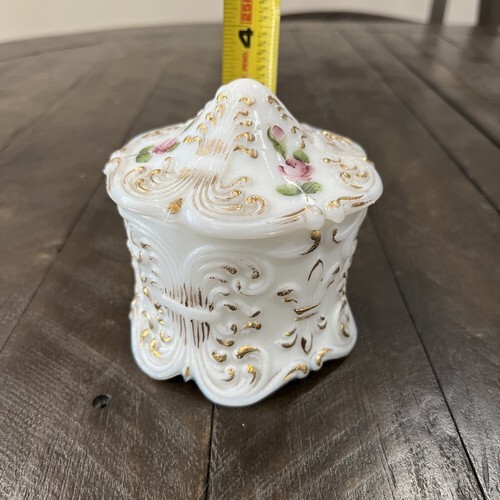 Vintage Victorian painted Roses & gold Gilding Milk Glass Vanity Powder Jar