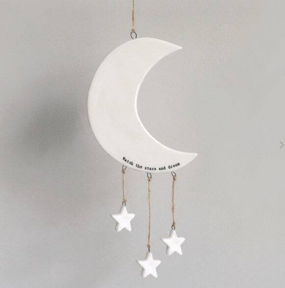 The front of the mobile features black writing which reads ?Watch the stars and dream?. The mobile is shaped like a moon with brown twine hanging from the base.