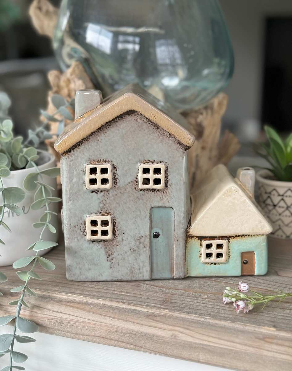 Cottage Pottery Grey/Aqua Two Tealight Houses