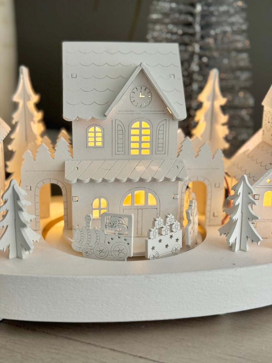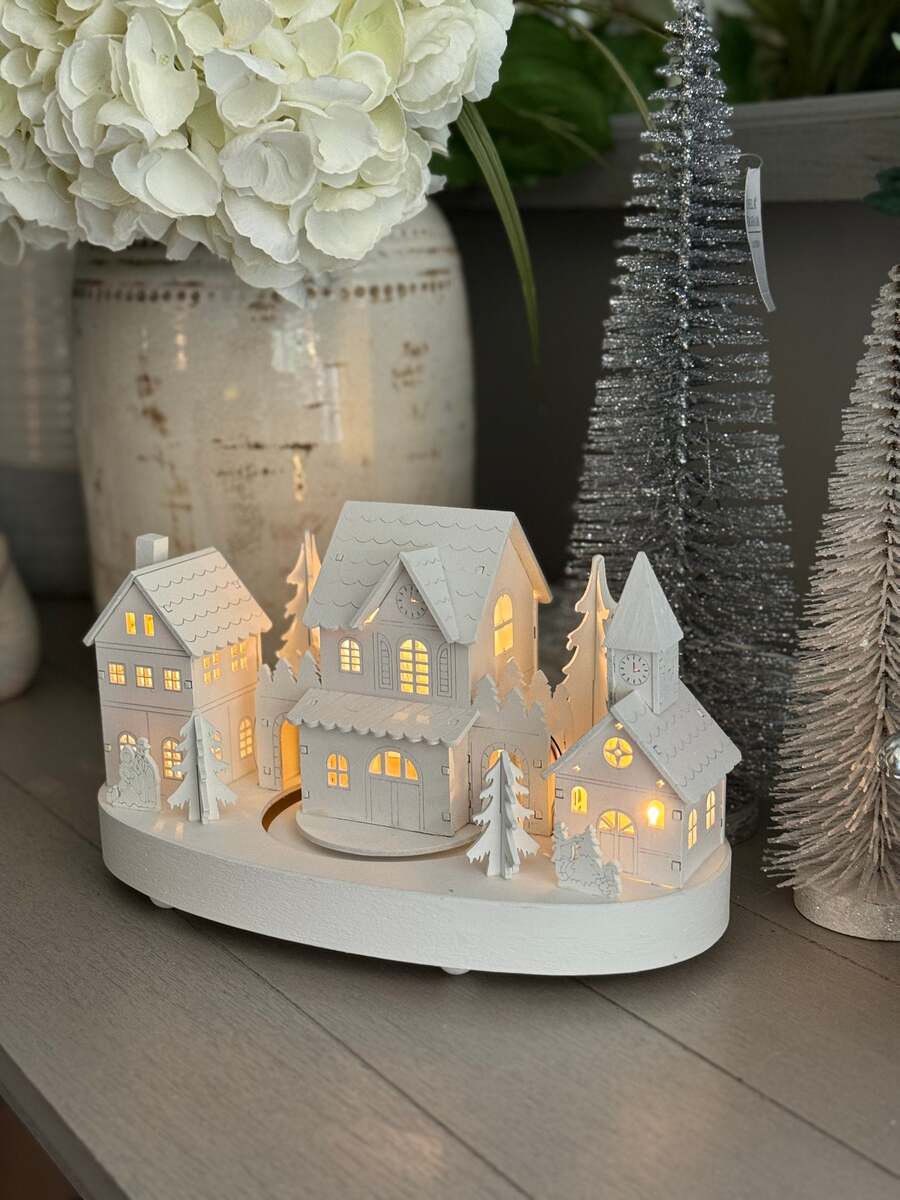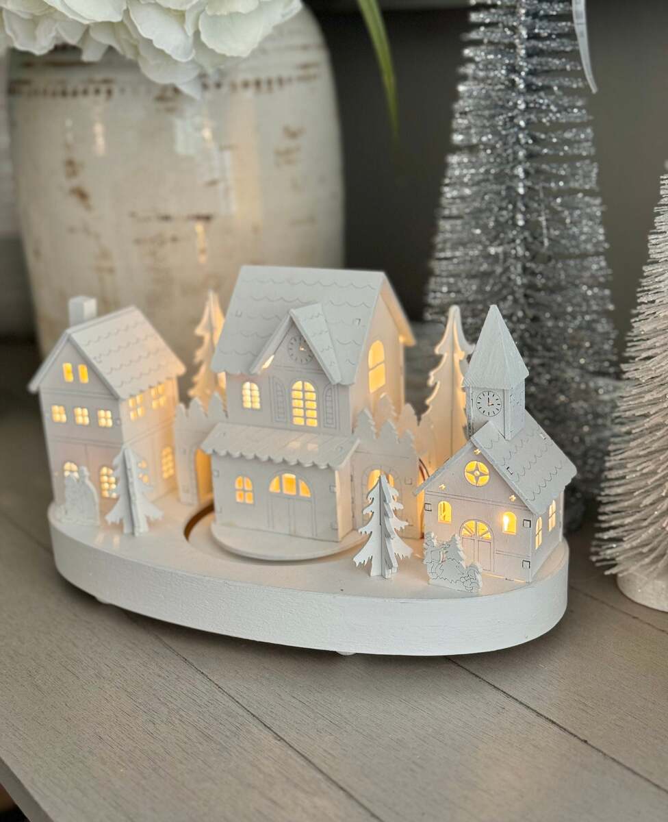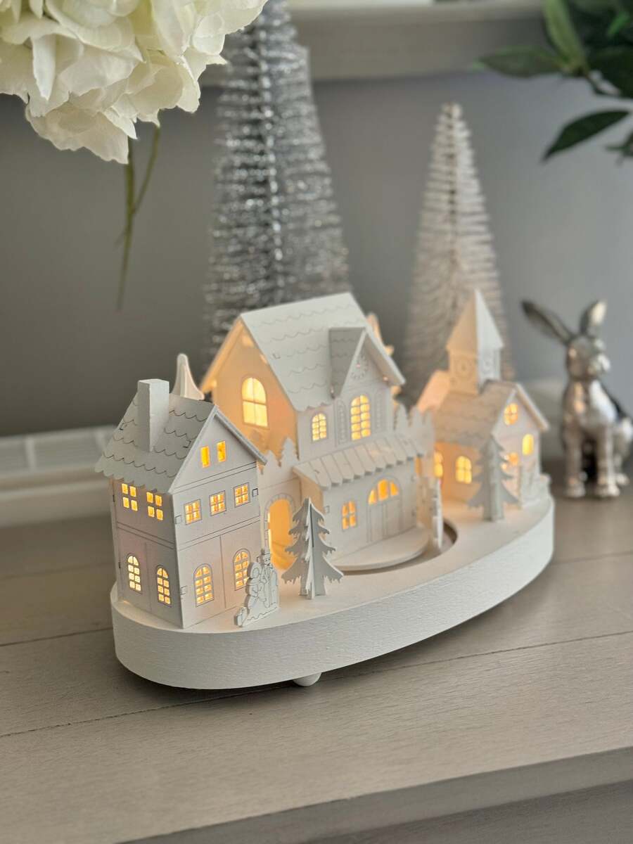 This lovely white wooden house with a sweet rotating train. A snowy village scene with a central house. A working train travels around the house in a circle with a chapel on one side with white Christmas trees