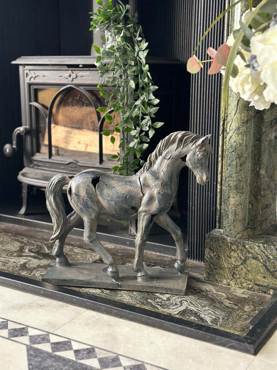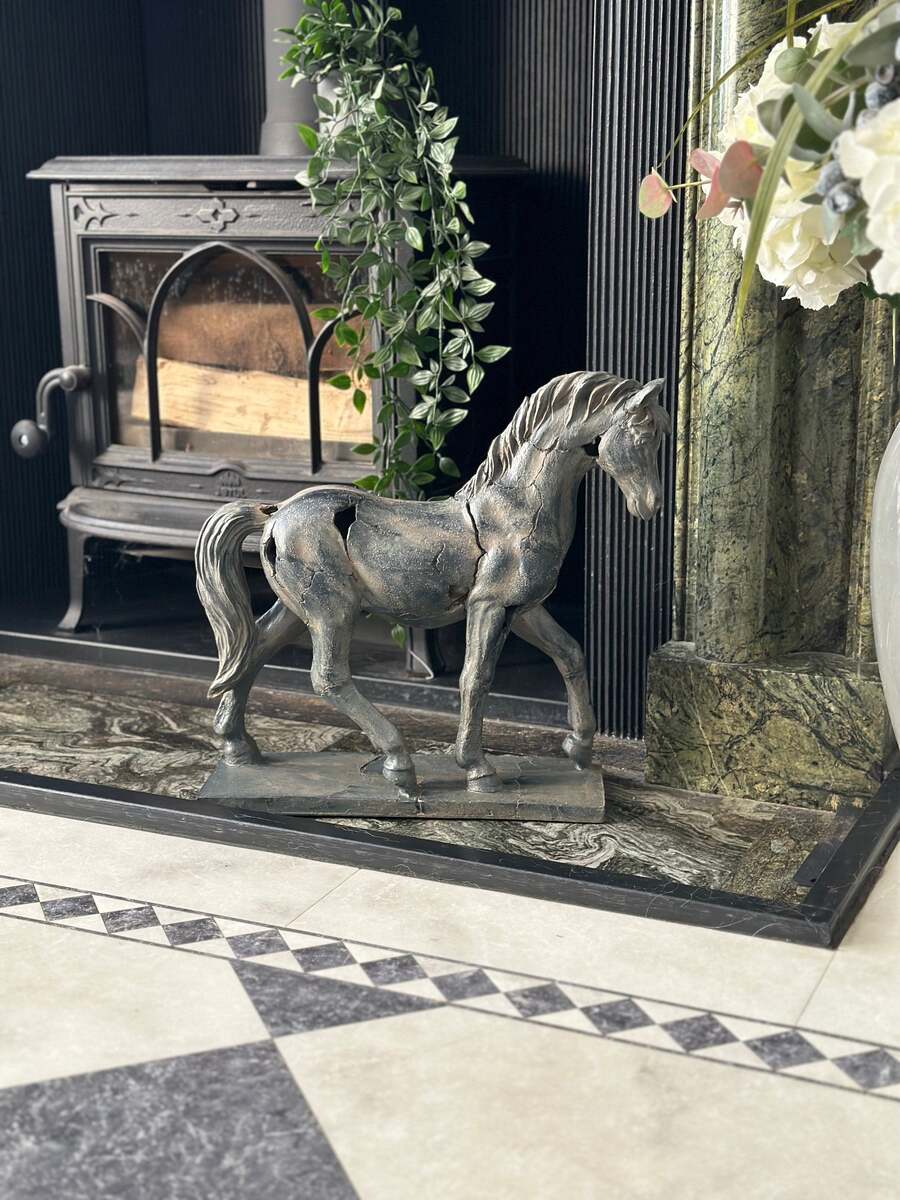 Antiqued Horse ornament with a "broken" effect to give an antique feel to the piece. This antique style statue will add a touch of class to your mantlepiece.