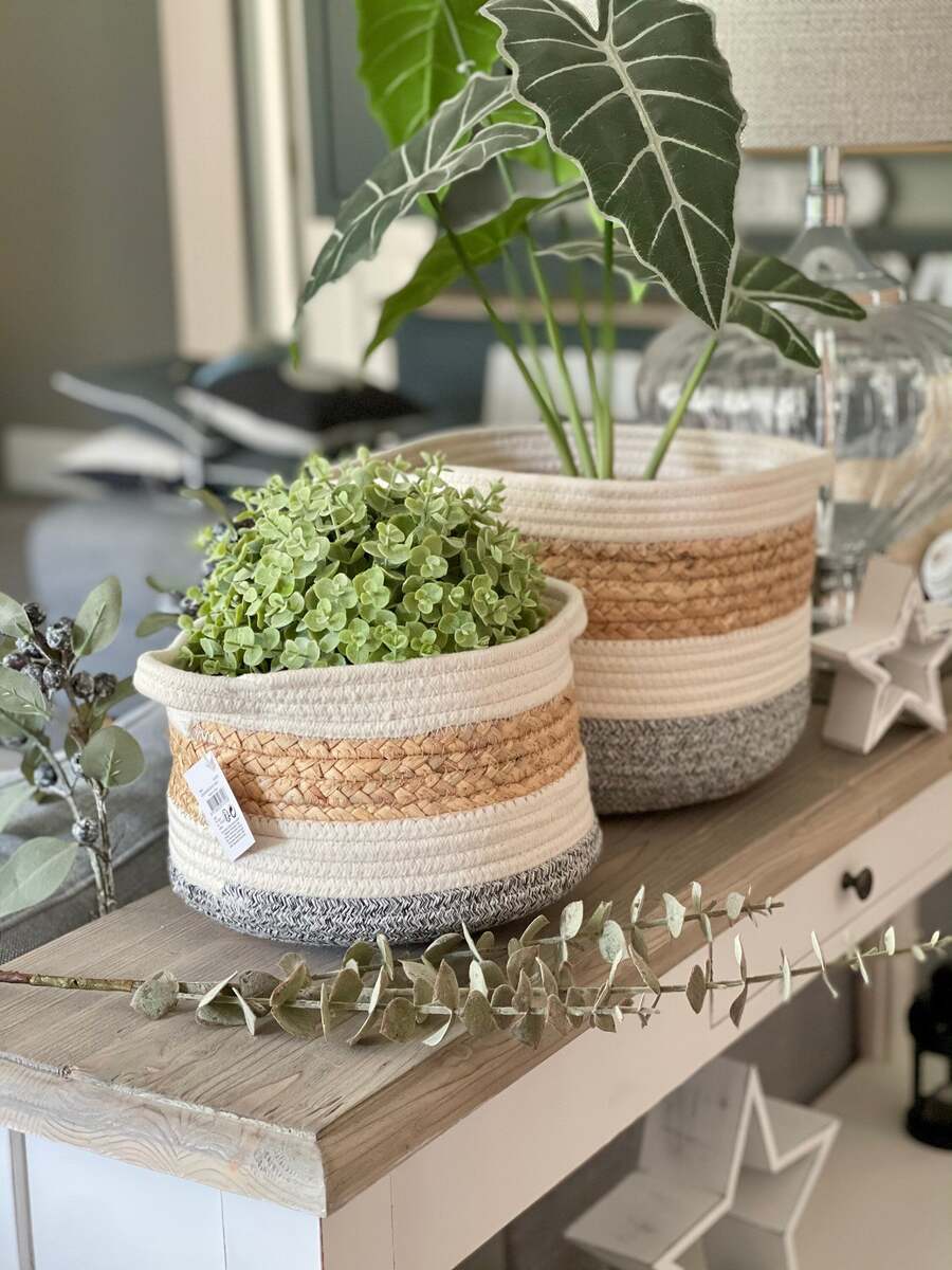 A set of 2 natural, white and grey woven storage baskets with handles.