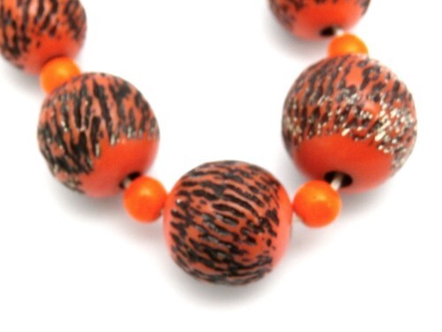 Vintage 1920s molded glass bead necklace of orange beads with black paint in the textured areas.