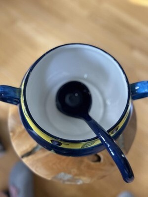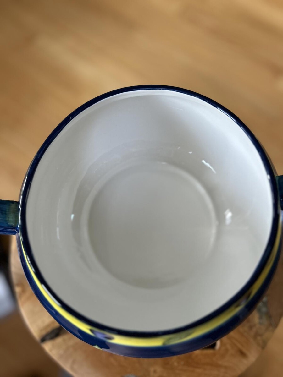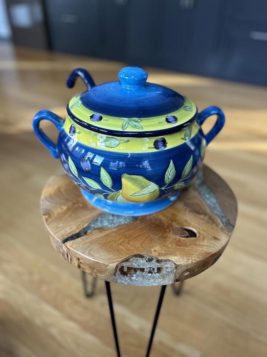This ceramic soup tureen features a vibrant blue and yellow design with decorative leaf patterns.