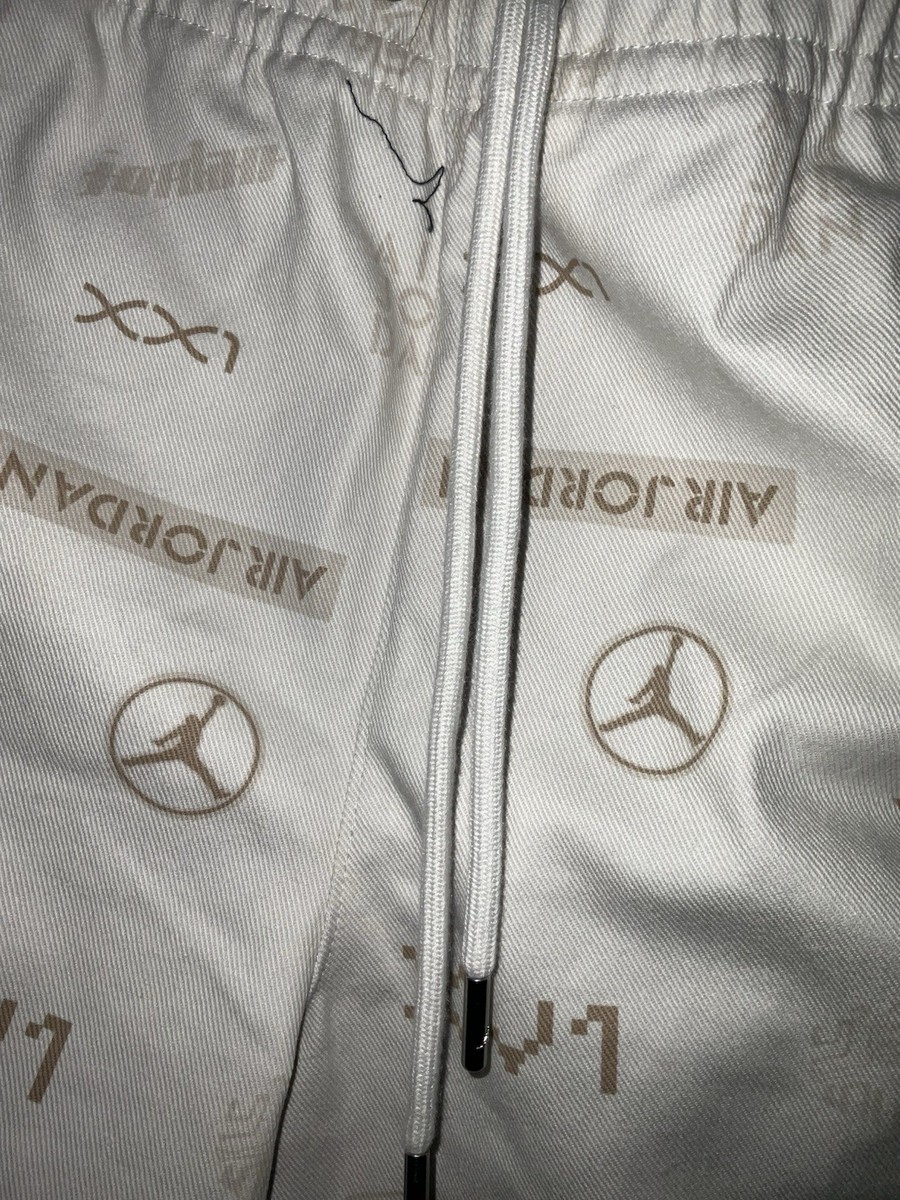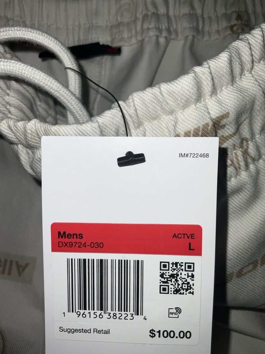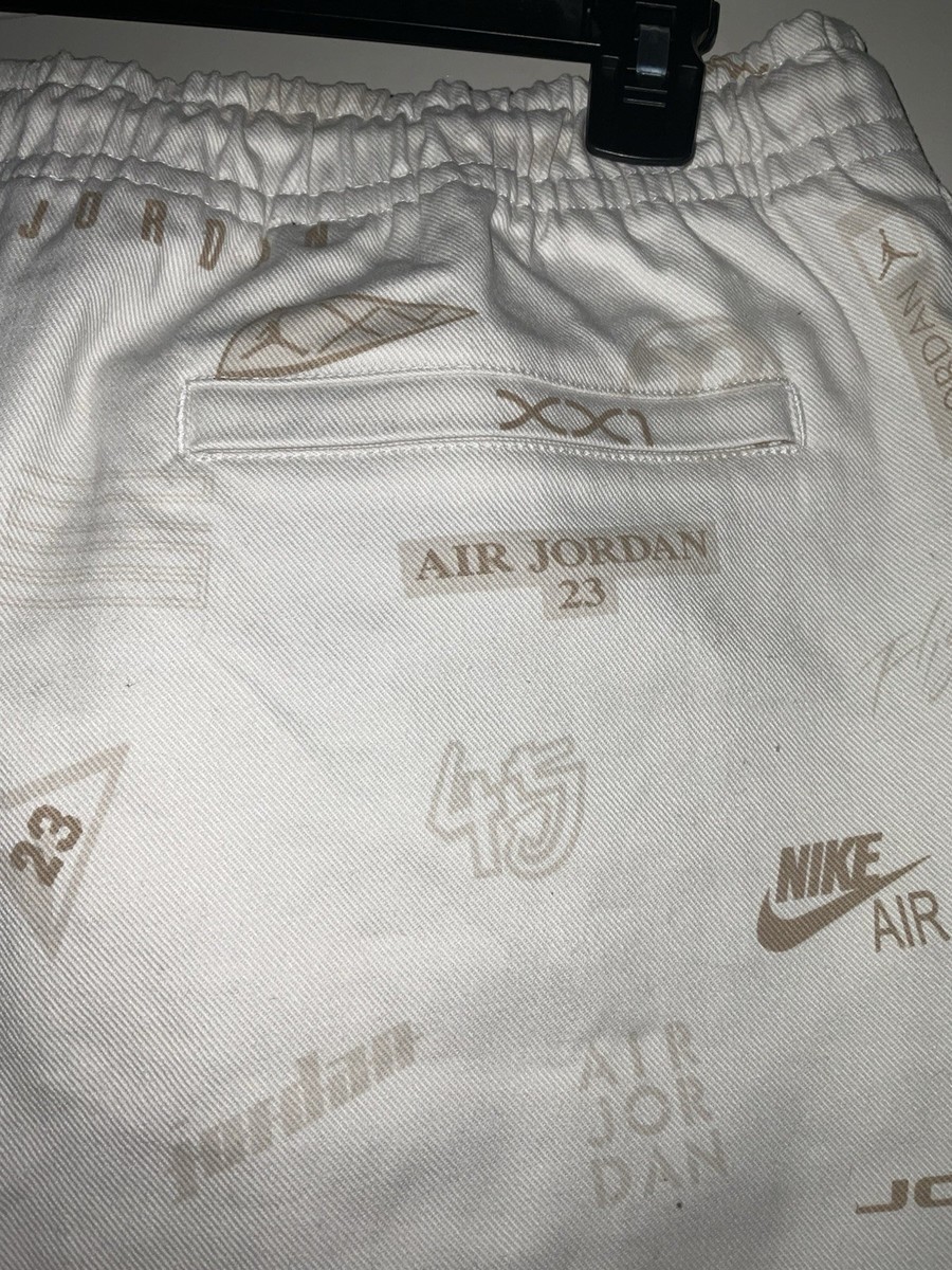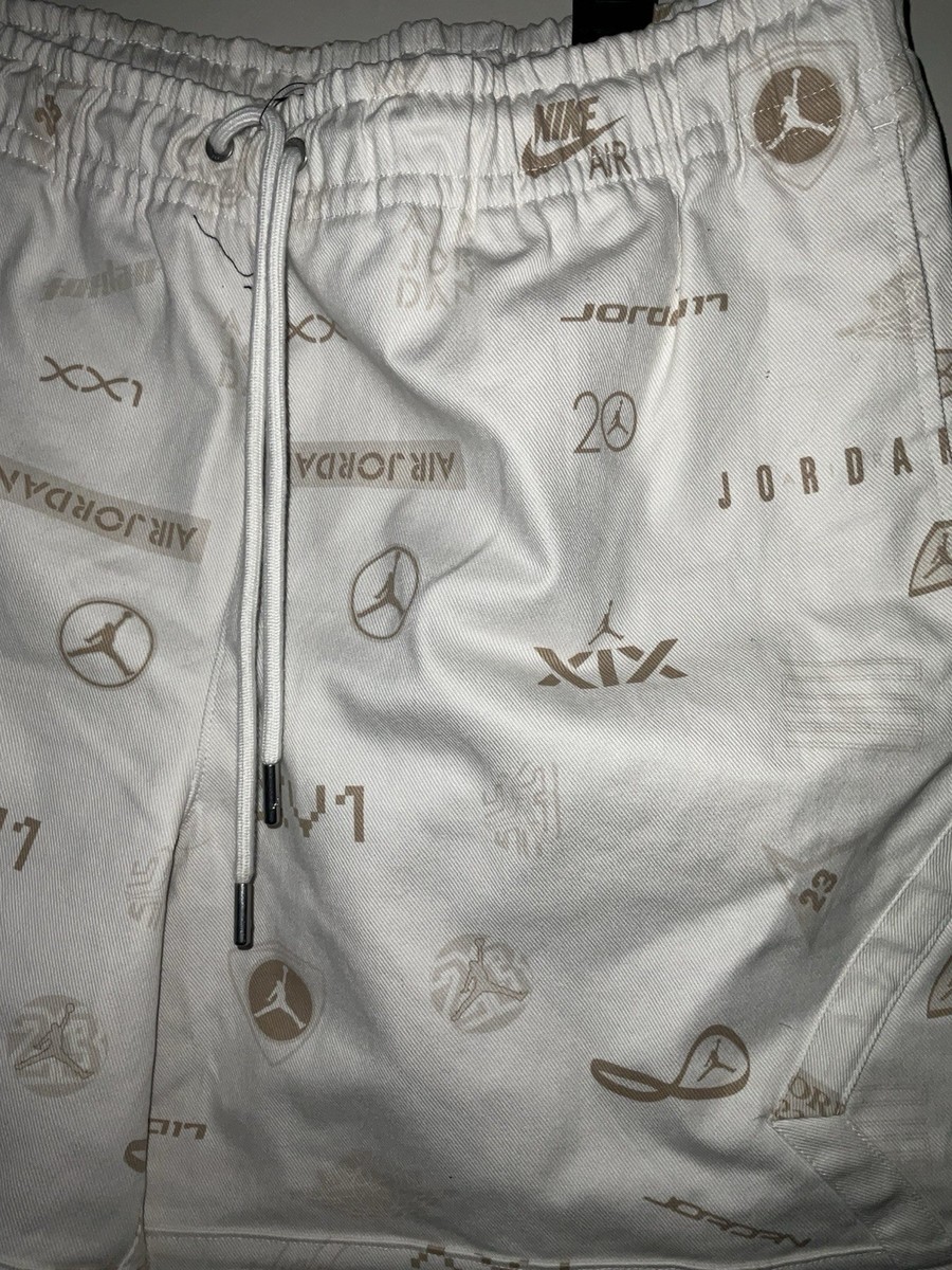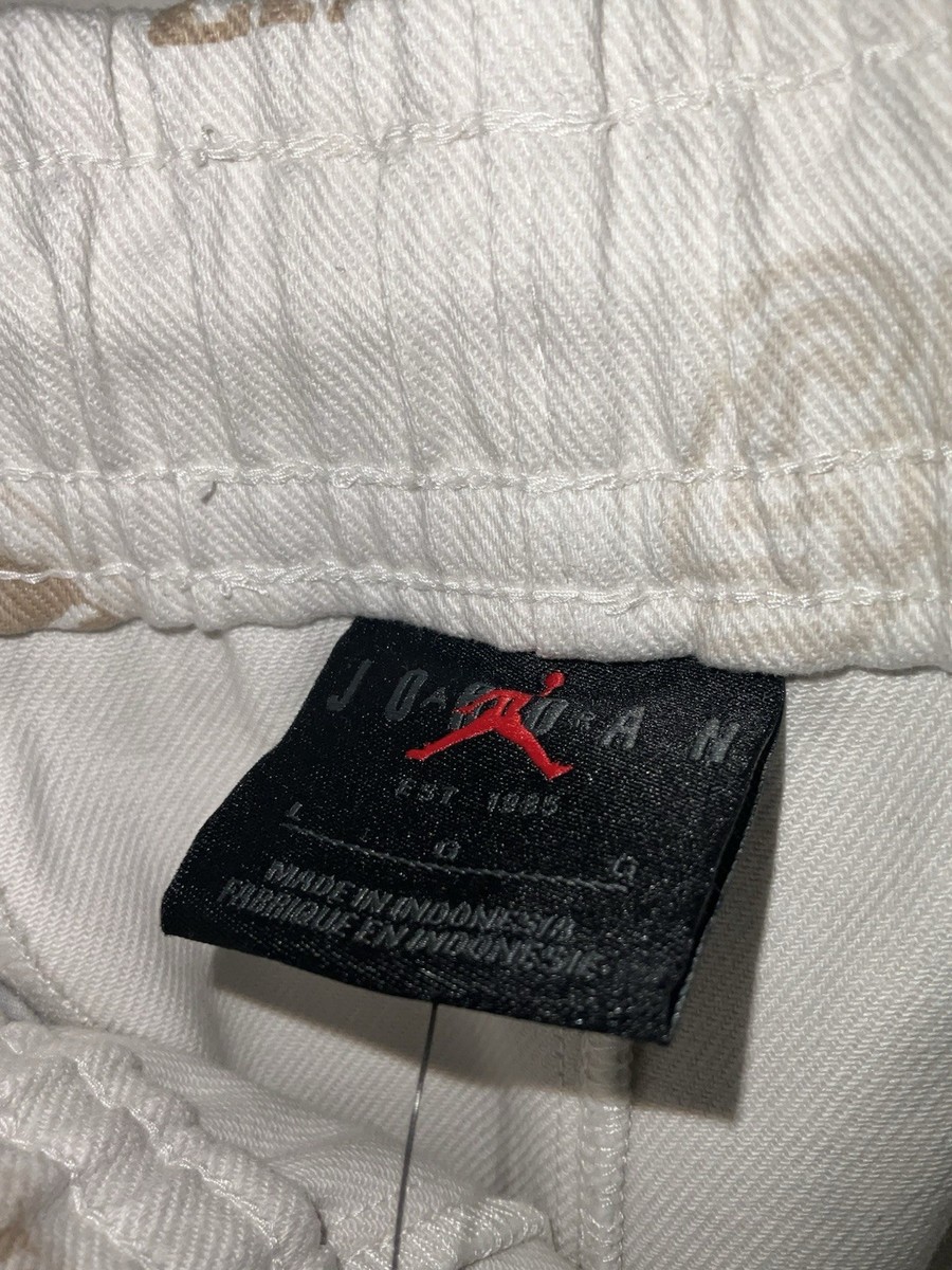 The product is a pair of Air Jordan Flight Heritage Premium Men's Shorts in tan, size large. These athletic shorts feature a solid brown color with the iconic Jordan logo, perfect for a 90s sports-inspired look. Made of a comfortable spandex and cotton blend, these shorts have a drawstring closure and are machine washable for easy care. Ideal for activities like gym training, walking, and basketball, these shorts offer a regular fit and are suitable for summer, fall, and spring seasons.