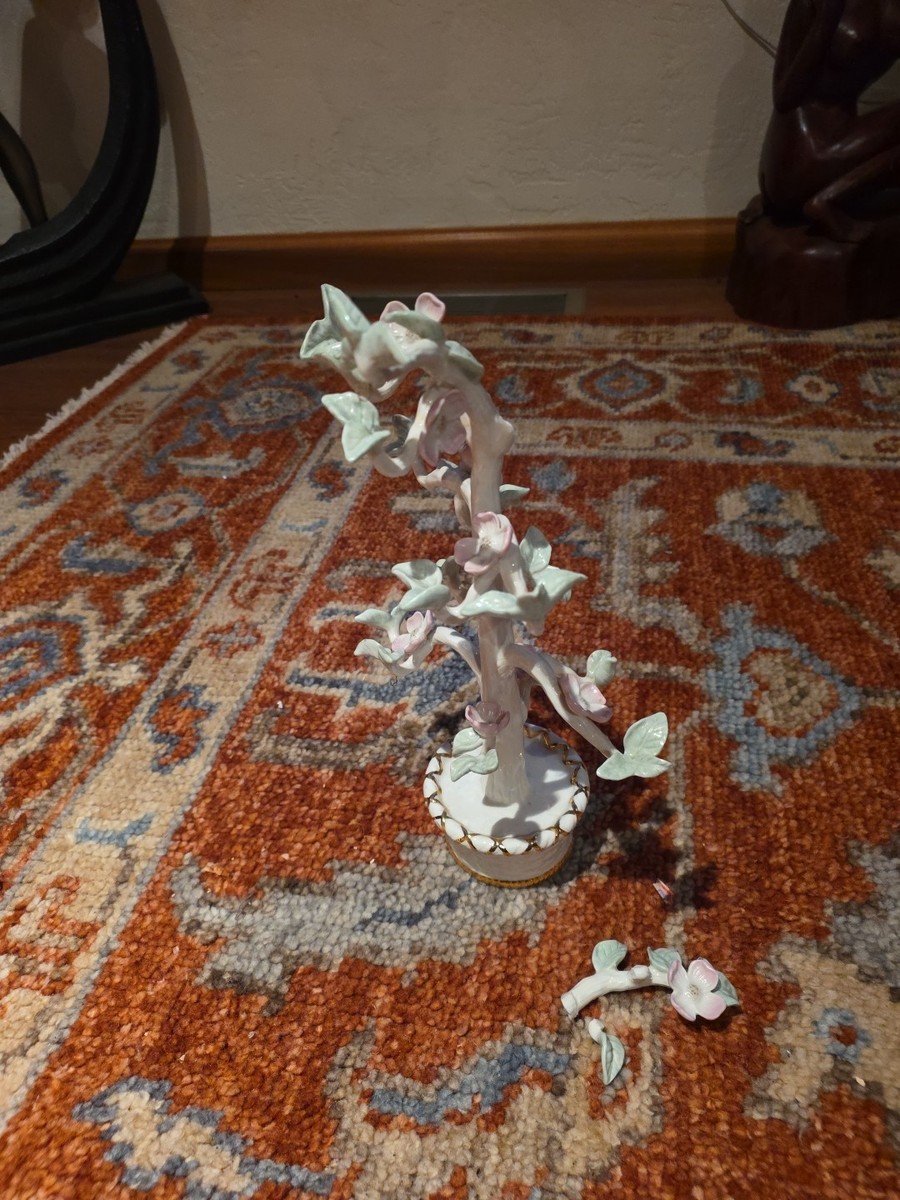 The tree has 2 different flaws. There is one branch that is broke off which is included and just needs glued back on. That branch has one leaf broke off which is also included and just needs glued back on.