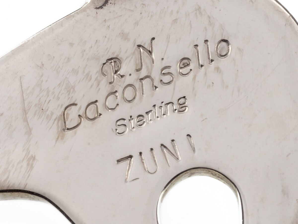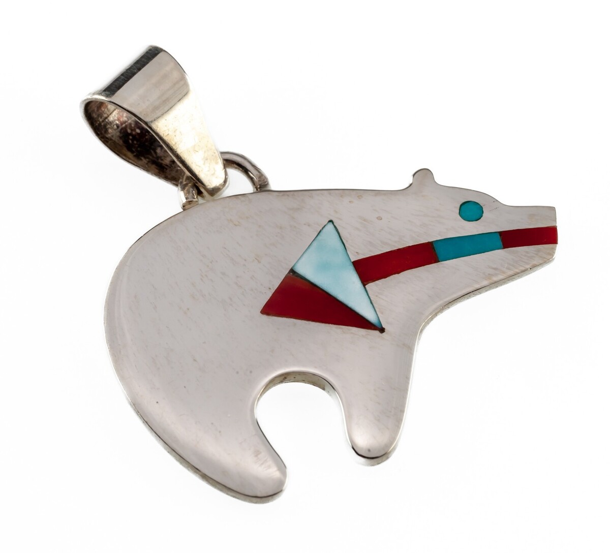 Rudell et Nancy Laconsello Zuni Sterling Pendant la forme d'un ours avec une incrustation de corail turquoise et rouge