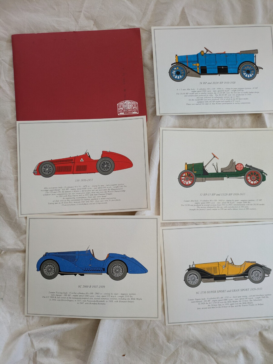 Un folio de impresiones artísticas de autos Sports Alfa Romeo Milano, que consta de 7 impresiones que miden 12 x 9 pulgadas cada una, fabricadas en Italia. Estas estampas son una pieza de coleccion relacionada con el transporte y la automobilia.