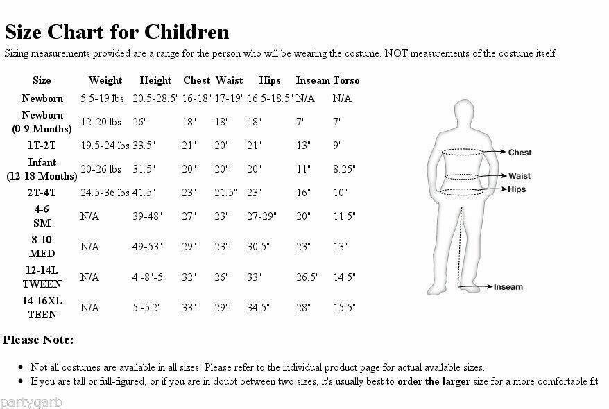 NOTE: Listing is for items listed as included only. Some accessories may be pictured but are not included. All are new in package. Costumes will have wrinkles / creases from being in package, please see care instructions before trying to iron, etc. A quick and easy way to help eliminate wrinkles is by using a spray bottle form of fabric wrinkle releaser (not included). New in package items may have long / loose threads or strings that may require trimming, these are not considered defects. For Costumes, please refer to chart in this listing as reference for estimating size, always choose a size larger if borderline. Individual results will vary. Please note everyone's body is made different and costumes may not fit as they fit the models in the photos. If you are unsure of the size you need or if your in between sizes, please choose the larger size. These are costumes and should fit comfortably. All sizing information is provided by manufacturer. NO RETURNS OR EXCHANGES ON COSTUMES. Some Features, Packaging, Colors and Texture may vary slightly. Manufacturer may change some Features, Packaging, Colors and Textures so actual costume may vary slightly from picture. Any known differences will be stated in description. Manufacturer's Photo. Sold as is New in Package. This item may ship in an envelope: folding and or removal of plastic hanger may be necessary.