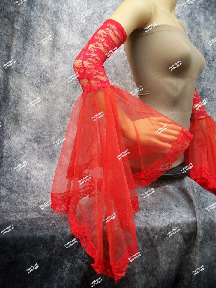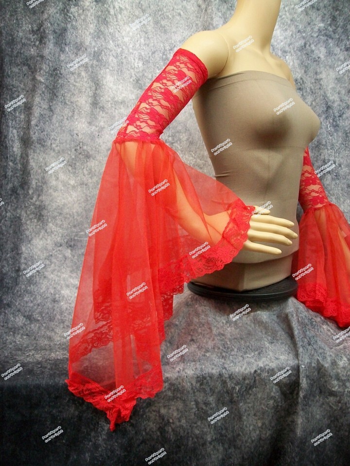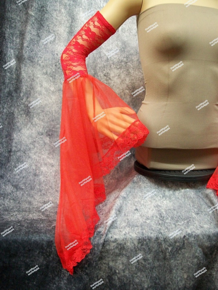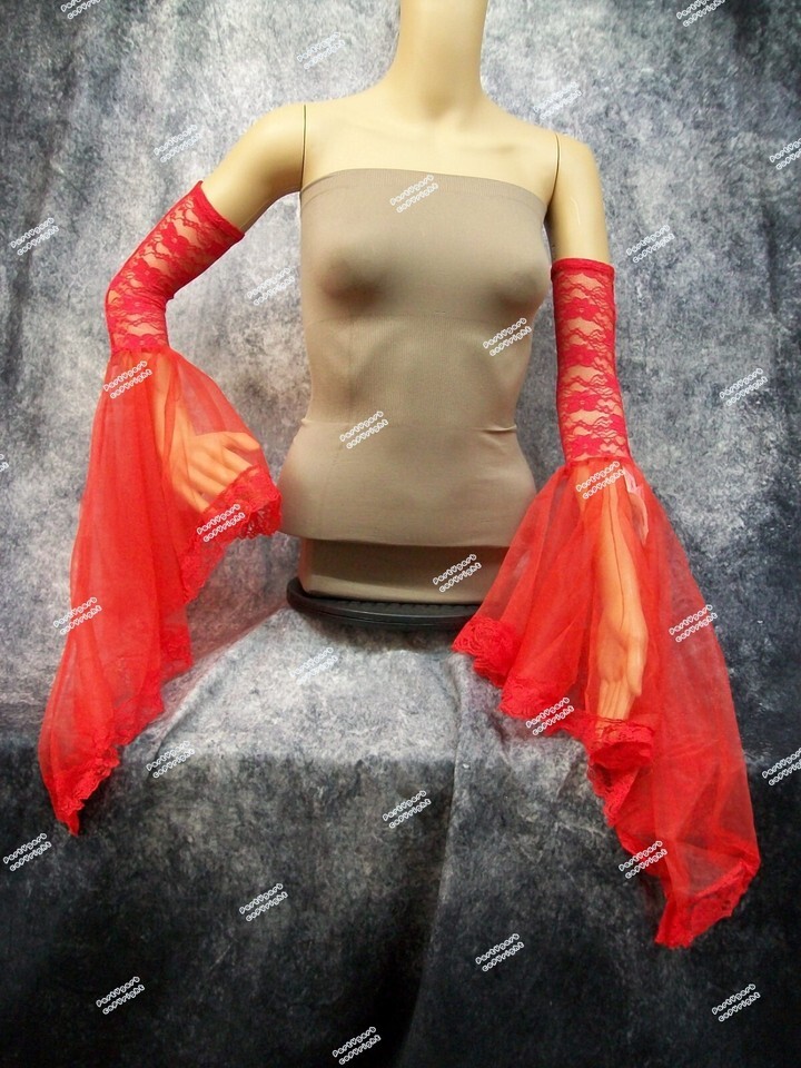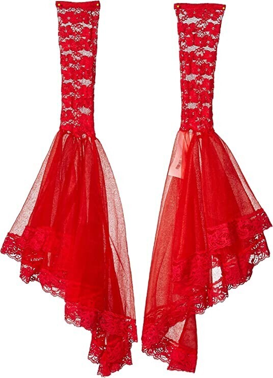 Red Lace Arms with Lace edged Netting. Like arm warmers. Ends are Open. Top end has elastic. Bottom Ends are different lengths to give it a tapered look. Seam edges don't line up straight. May have some long threads that need trimmed. Arms look small. The lace is a different shade of red on the arm sleeves compared to the netting. Will have some wrinkles creases from being folded in package. Not a licensed Beetlejuice Accessory.