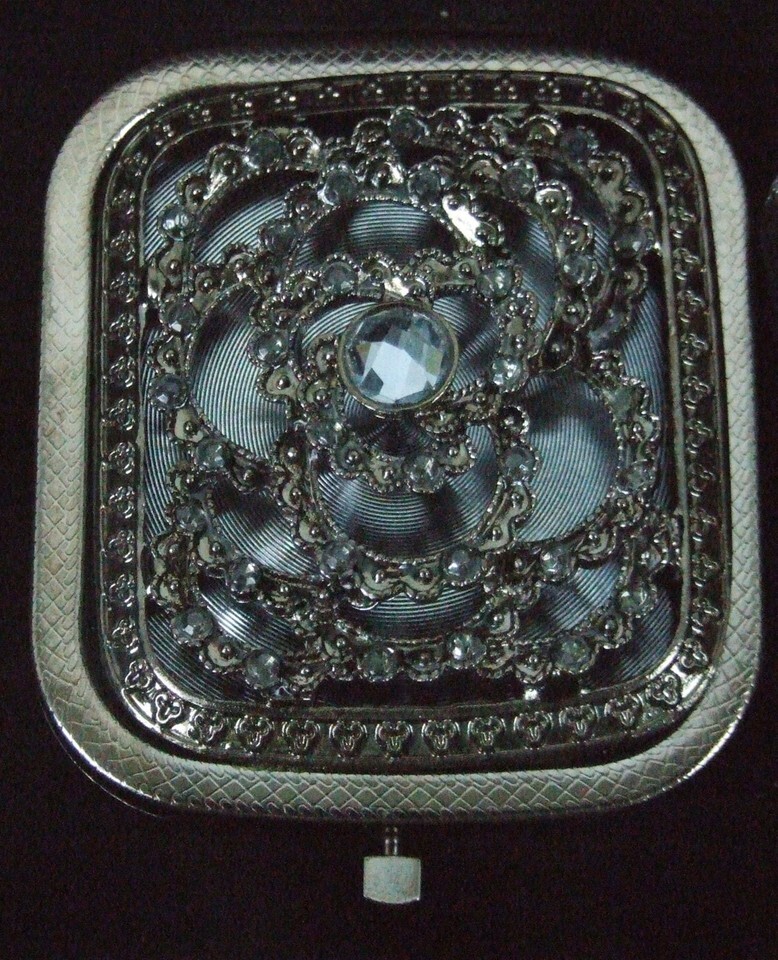 Miroir russe fabrique a la main en cuivre a enrobage sombre. Cette piece s'ouvre avec 2 miroirs interieurs. La conception est ornee avec une decoration de demi-cercles avec de petites pierres. Au centre de l'avant se trouve une plus grande pierre precieuse montee au milieu de la piece, c'est un produit de Berniee. Les photos ne montrent pas l'article comme il semble vraiment.