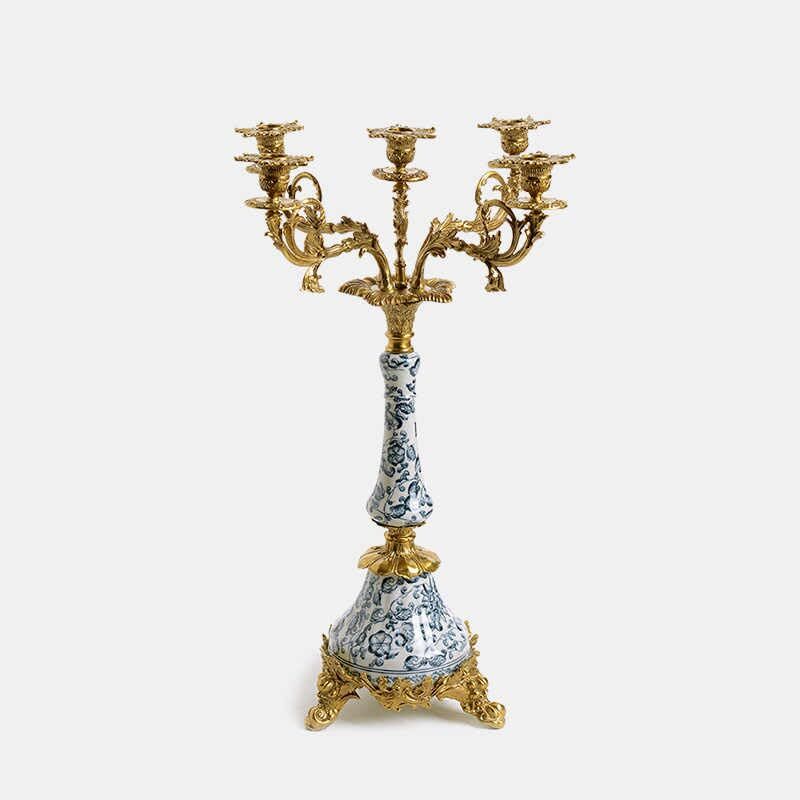 Blue and White Porcelain Brass 5-Arm Candelabra  Court Style Candle Holder for