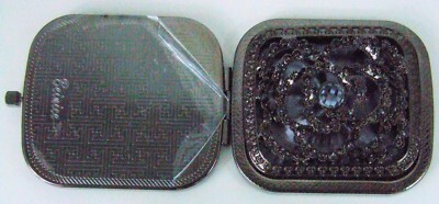 Specchio artigianale russo a mano composto da rame rivestito scuro. Questo pezzo si apre con 2 specchi all'interno. Il design e ornato con un arredamento di semicerchi con piccole pietre. Al centro della parte anteriore c'e una gemma più grande montata nel mezzo del pezzo, questo e un prodotto di Berniee. Le foto non mostrano l'oggetto come sembra davvero.