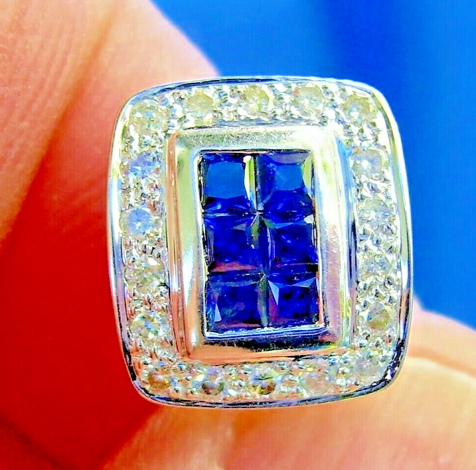 Natural sapphires mystery invisible set surrounded by diamonds in solid 14k white gold.