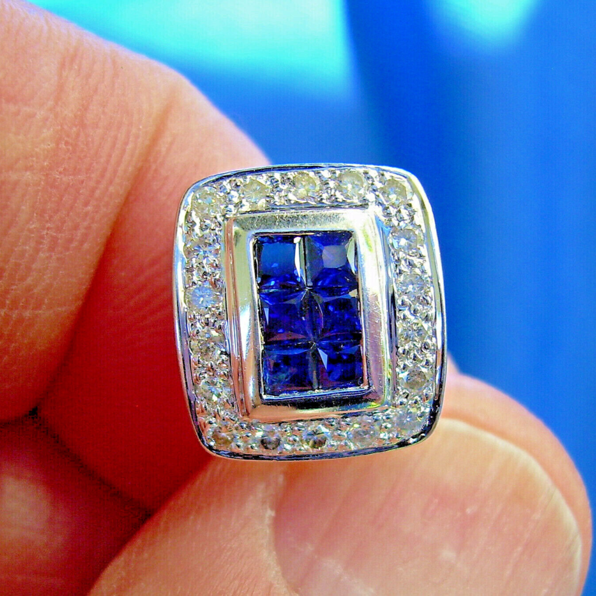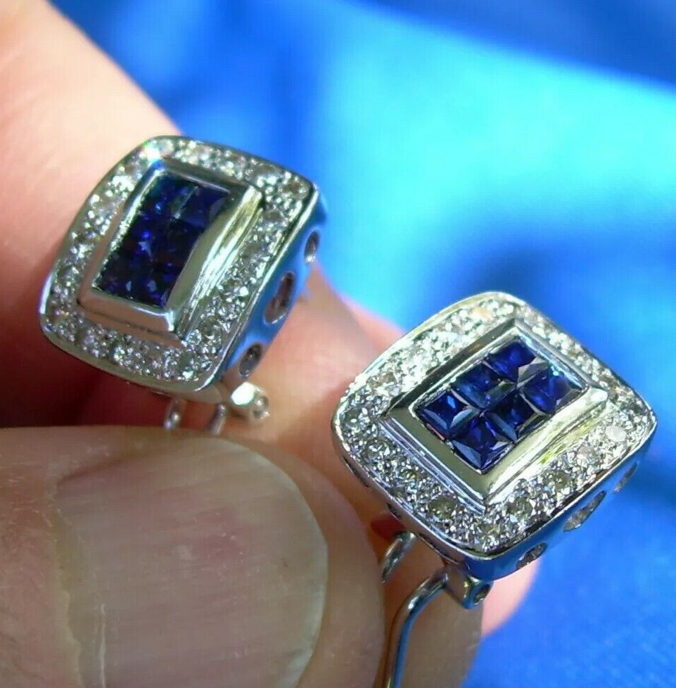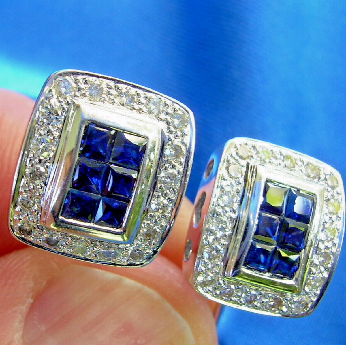 Earth mined Diamond Sapphire Invisible set Deco Earrings Vintage Style 14k Gold