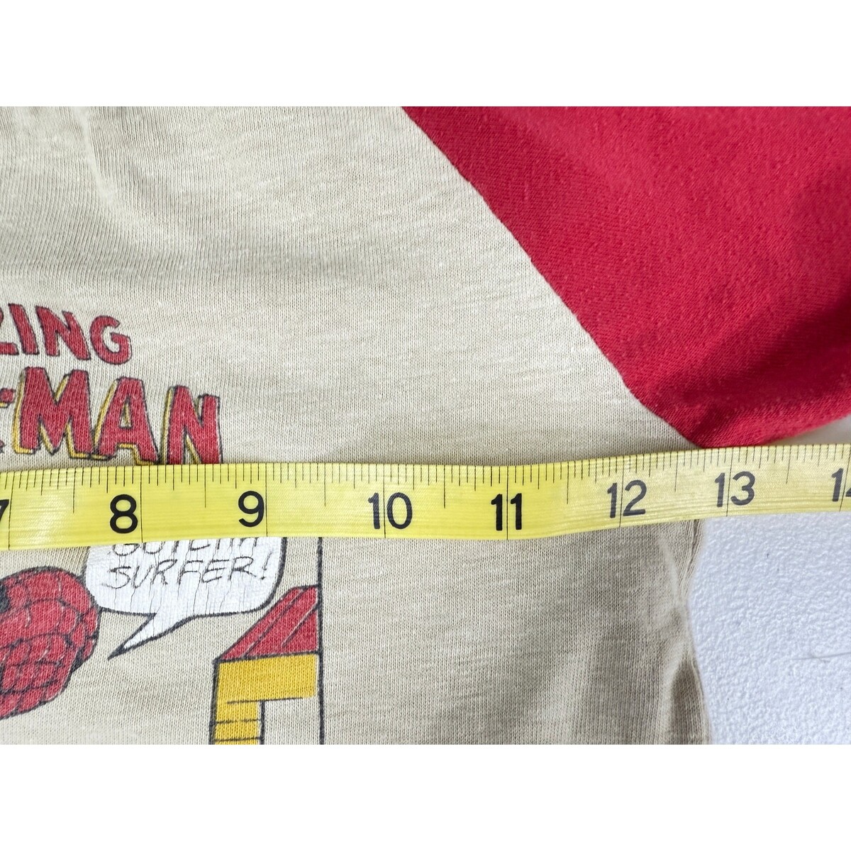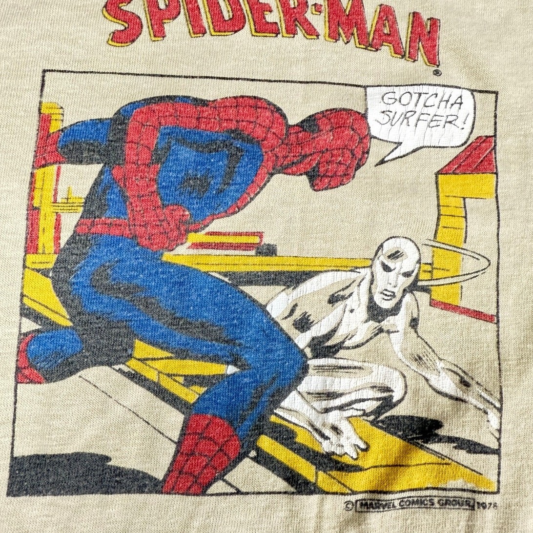 Unleash your inner superhero with this rare 1978 Marvel Comics ringer t-shirt, featuring John Romita Sr. art of Spider-Man battling the Silver Surfer. A true collector?s piece from the Marvelmania late 1970s era, embodying the golden age of Marvel merchandising.