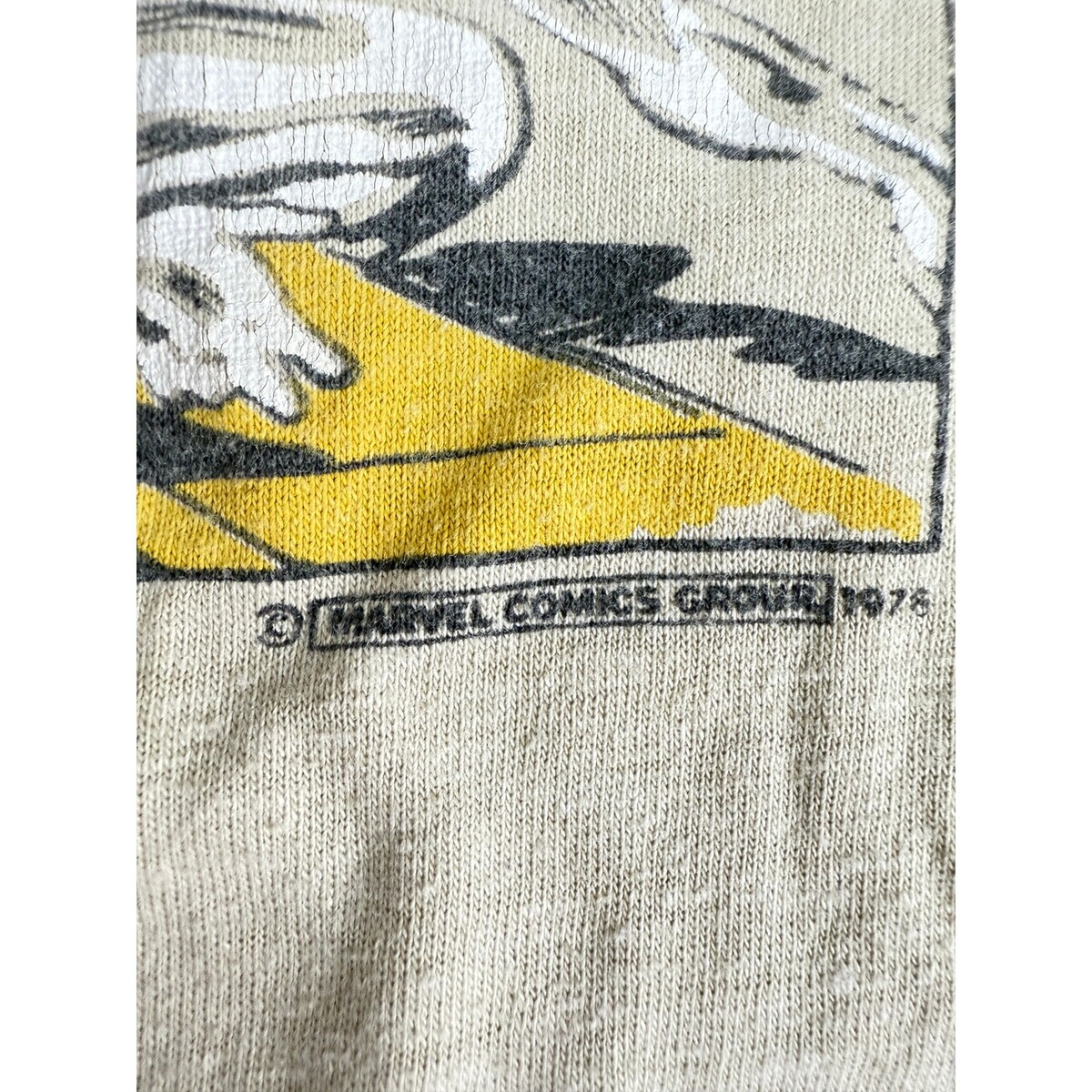 This is a genuine late-70s Marvel licensed shirt, with a classic ringer neck and sleeve trim. Though the tag is worn unreadable, the shirt measures as a Boys? Small (see below). The cotton is soft from wear, and the print retains strong vintage charm.