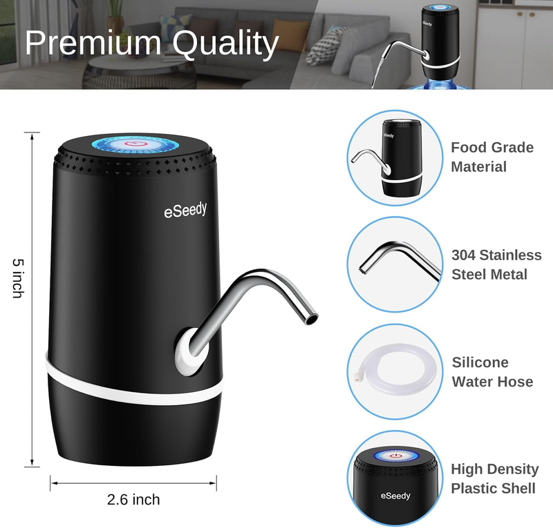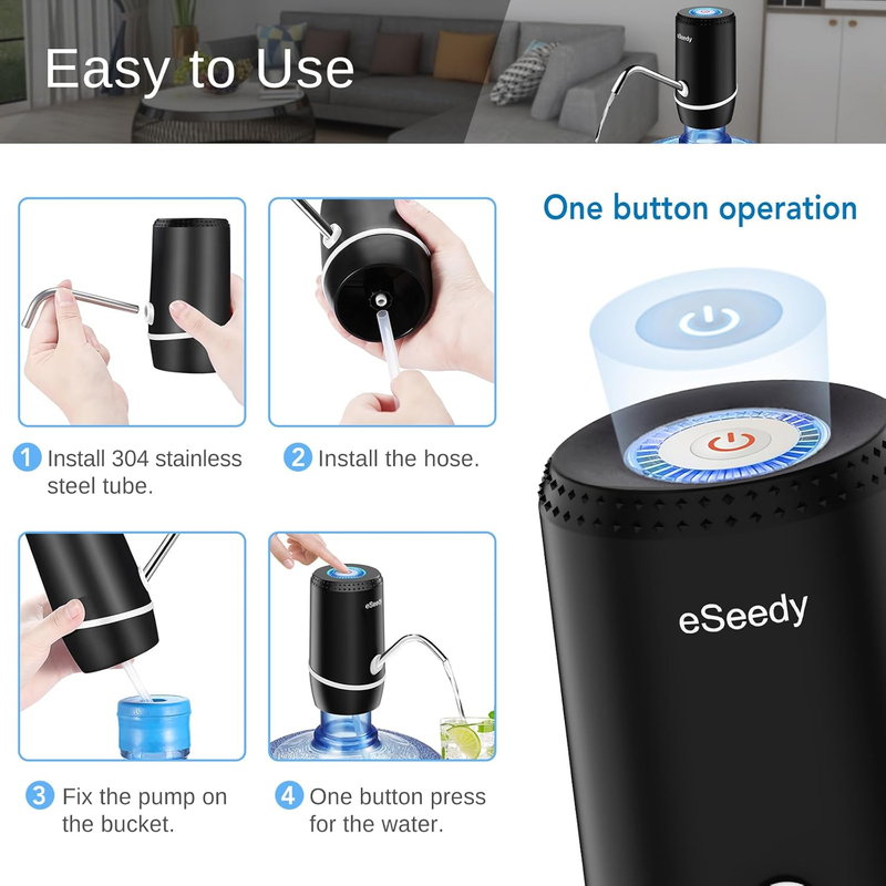 One Button Only: Press once to pump water. Press again to stop pumping. Safe and healthy 304 stainless steel spout, food grade silicone hose and high density plastic