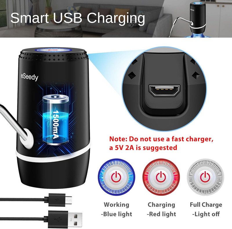 Rechargeable: Can use for around 4 ~ 6 bottles 5 gallon after a full charged. Only need to charge 1-2 times a month. Note: Do not use a fast charger, a 5V 2A is suggested. If unable to charge, try a new cable/charger or use power bank