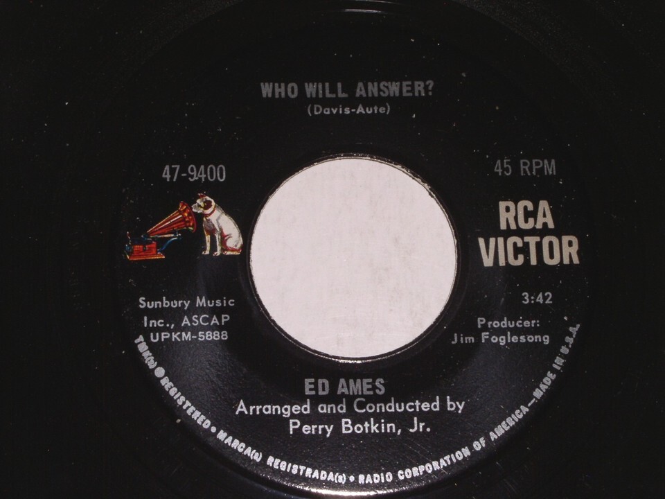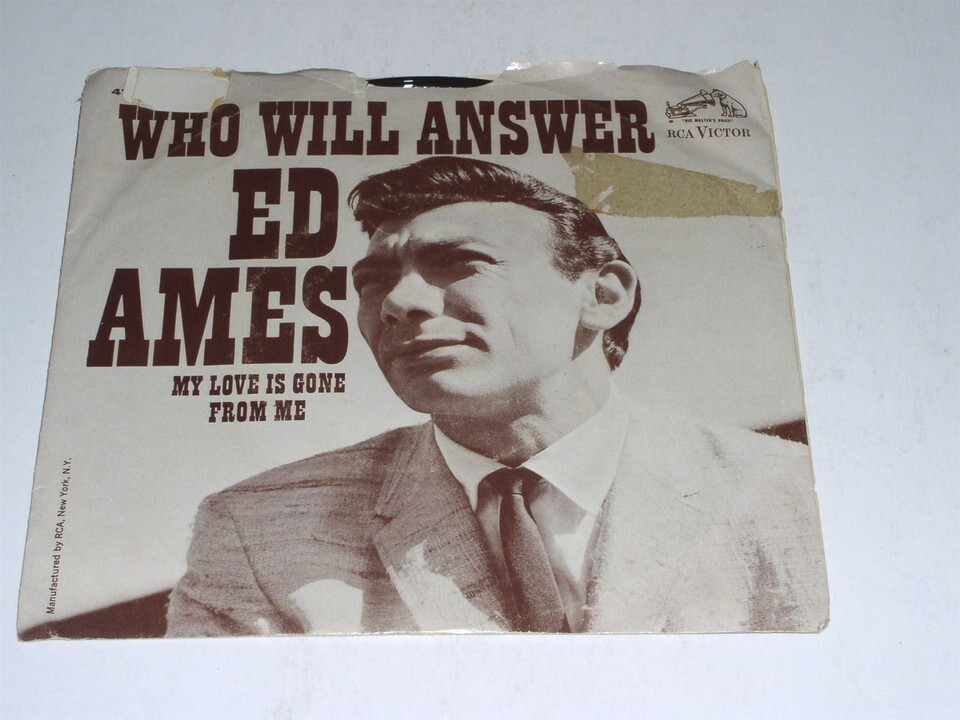 This is a vintage 45 rpm phonograph record by Ed Ames entitled, "Who Will Answer". Flipside: "My Love Is Gone From Me". Record Label: RCA 479400.