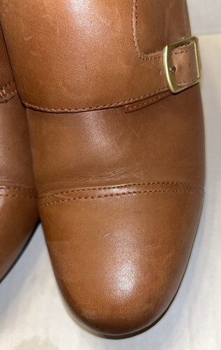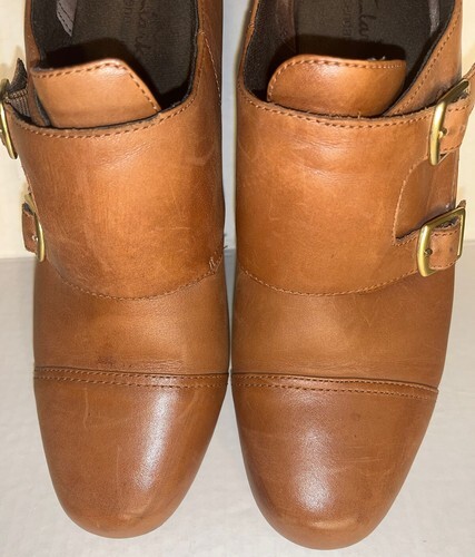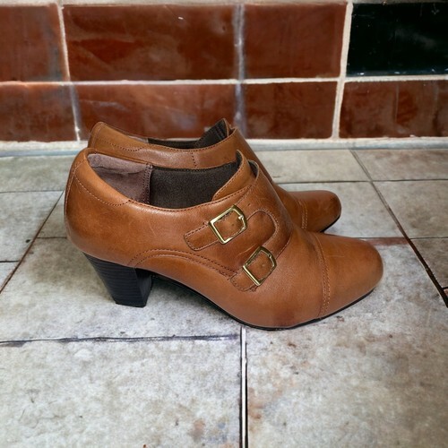 This listing is for a pair of Clarks Ankle Bootie Women 10M Leather Brown Gold Buckles Slip on Shoes. Heel is approx between 2.5- 3". Good condition-a few light scratches as shown in photos- and comes from a smoke free home!