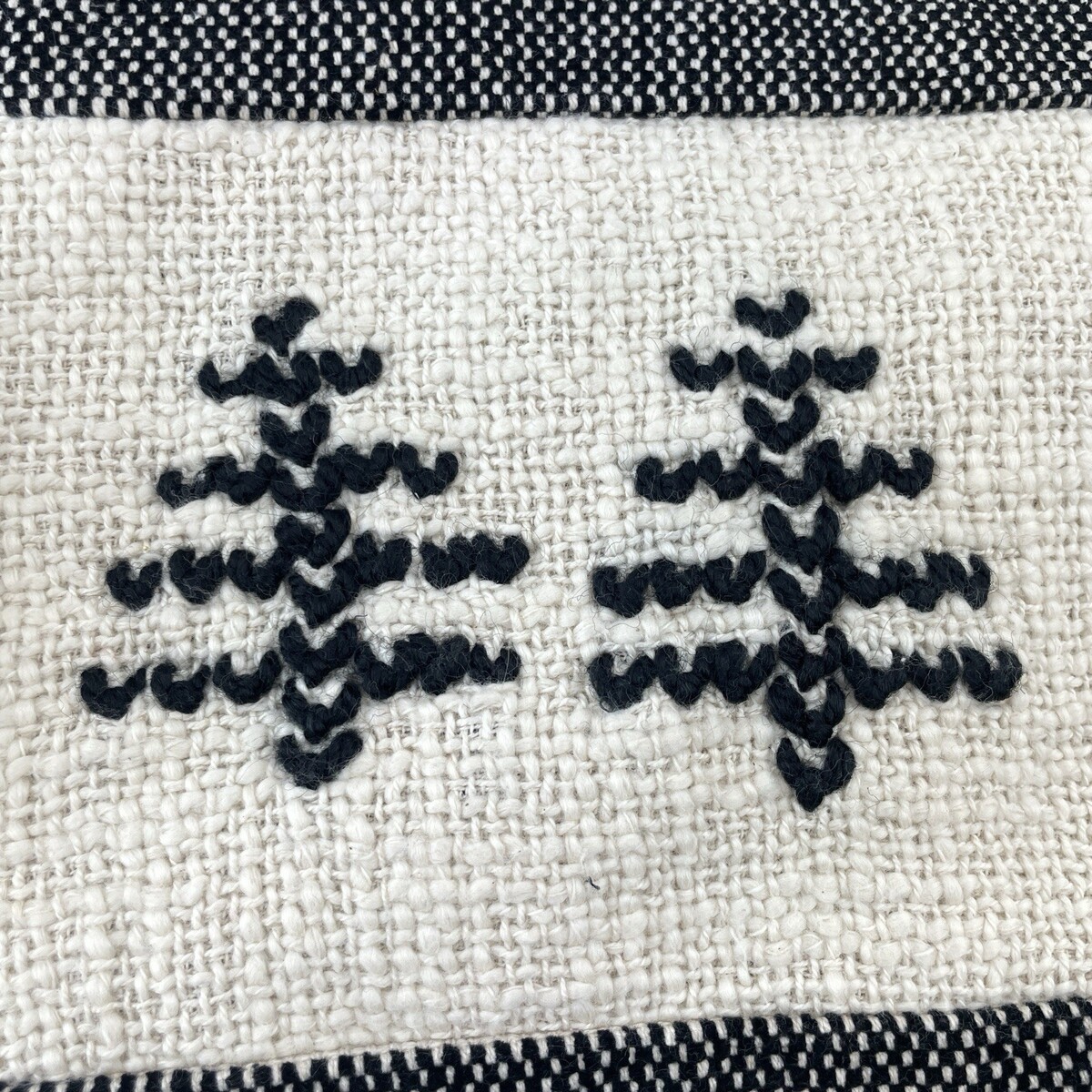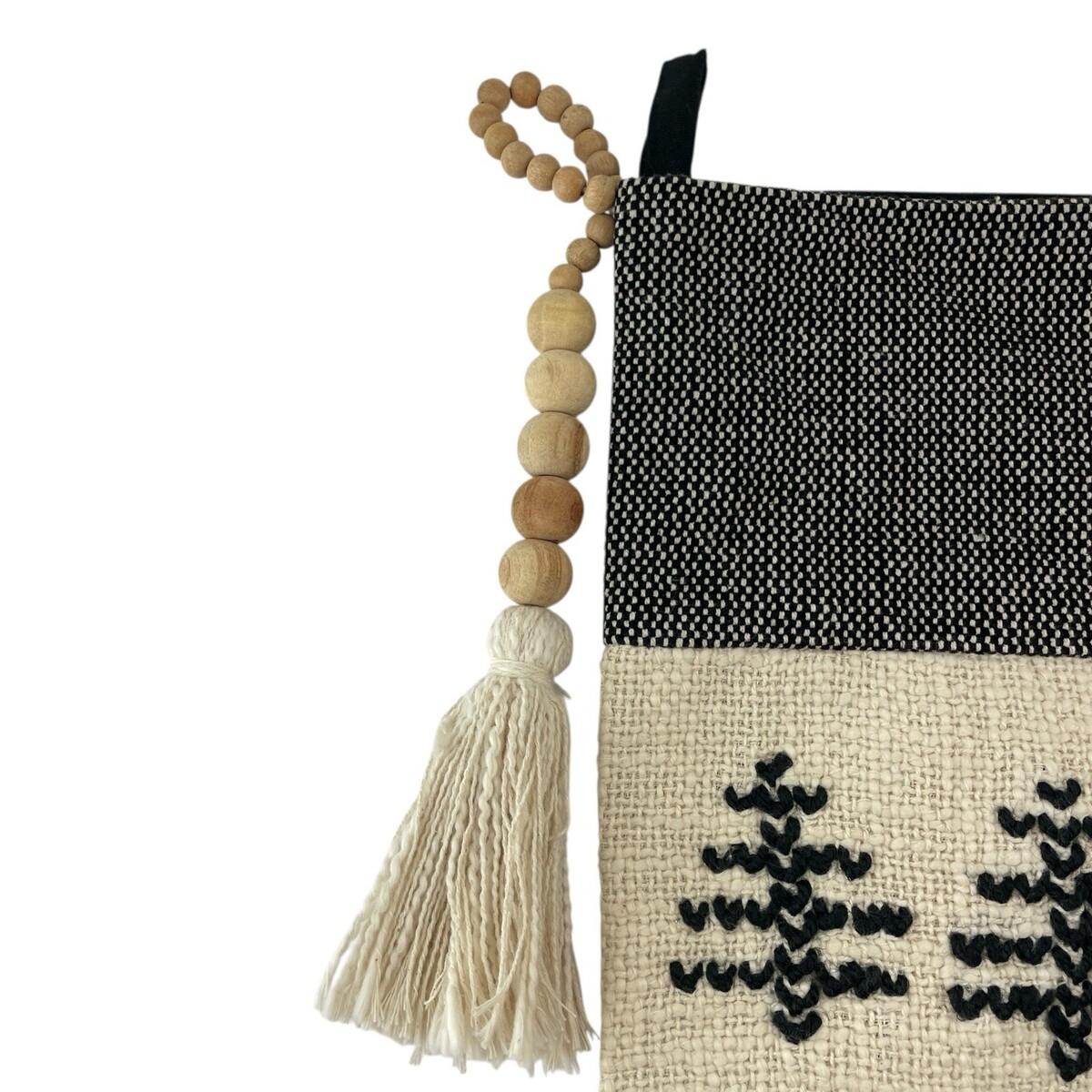 Creamy white background with embroidered geometric trees in black. Back is black cotton. Features wood bead tassel and loop for hanging.