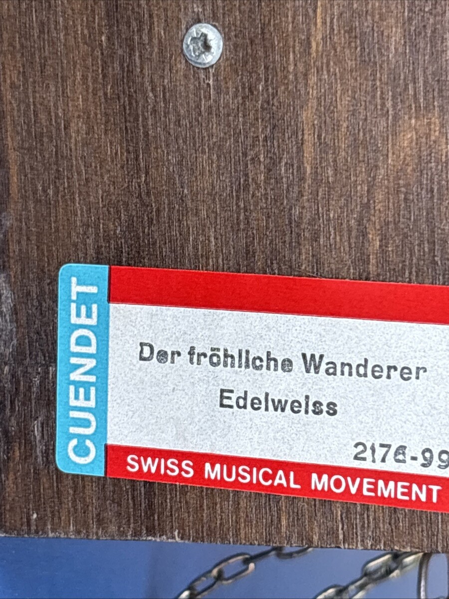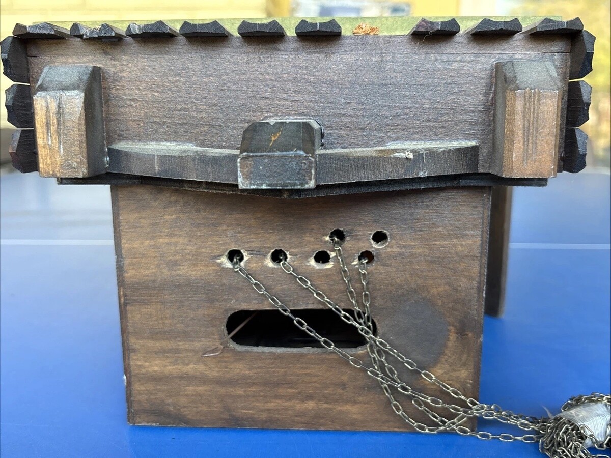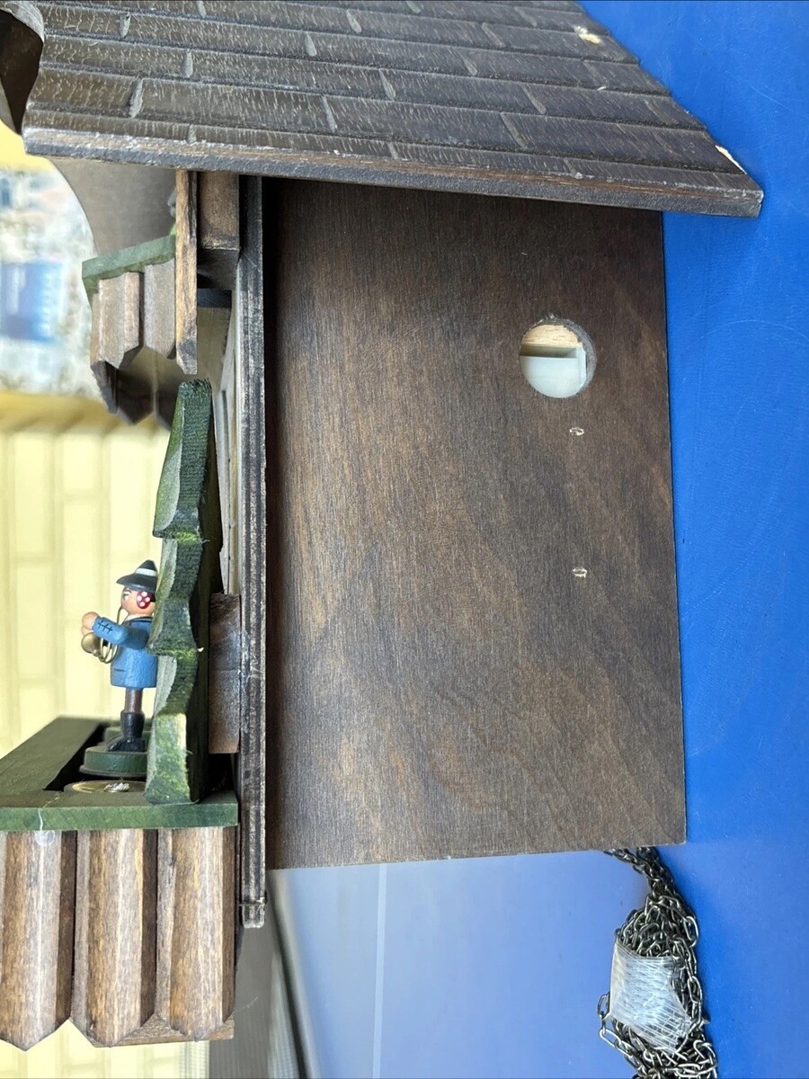 This Vintage CUENDET Swiss Movement German Cuckoo Clock is a unique and charming piece with a Multicolor design and Roman Numerals. The clock features a Mechanical movement, wooden frame, and a Black Forest style. With its musical theme and original features, this late 20th-century clock from Germany is perfect for any room in need of a touch of nostalgia and traditional elegance. Ideal for collectors or those looking for a special piece to add to their decor. Sold as is for parts or repairs