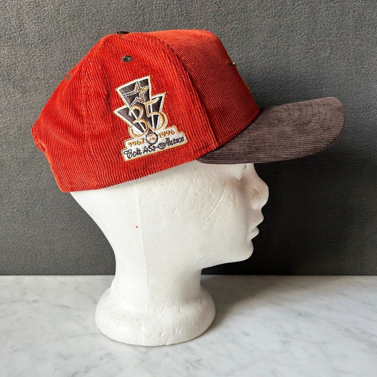 Vintage Houston Astros 35th Anniversary Cooperstown Collection baseball cap. Brown and rust corduroy 9FORTY cap features an embroidered MLB Astros logo on the front and a 35th Anniversary 1962-1996 logo on the side. Plaid undervisor. 100% cotton. Adjustable one size. Excellent condition.