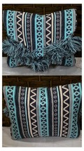 Featuring a chic striped pattern in navy, teal, white, and gray, the "Mud Pie" clutch purse combines geometric motifs, including zigzags and diamonds, with decorative pom-poms or tassels along the flap closure