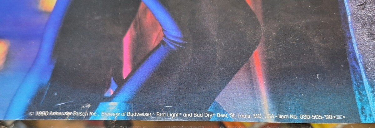 The product is a vintage 1990 Budweiser Light Dry "I Want To Drink Your Bud" Wolfman Halloween poster by Anheuser Busch Inc. This collectible Breweriana poster features the iconic Budweiser branding and is themed around beer culture. Made in the United States, this poster is a unique and nostalgic piece for beer enthusiasts and collectors alike, showcasing the playful and humorous tone of the era.