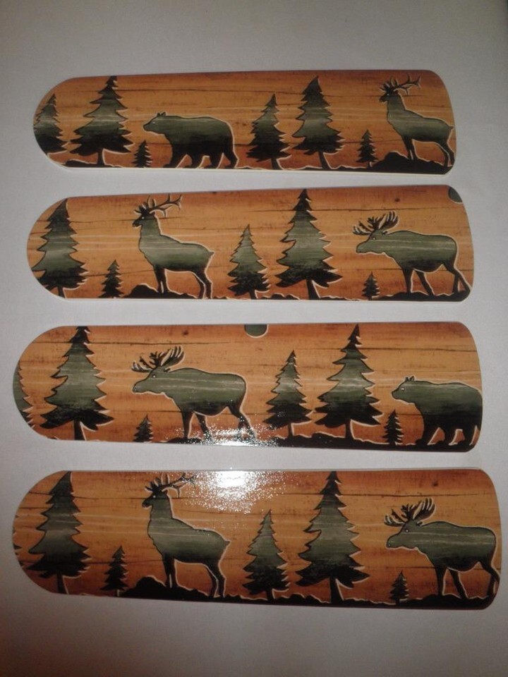 Only the blades have been removed to be custom handcrafted with fabulous moose, bear elk graphics. Graphics are applied to blades and then sealed with poly acrylic varnish to protect the finish. Graphics are randomly placed making each fan unique.