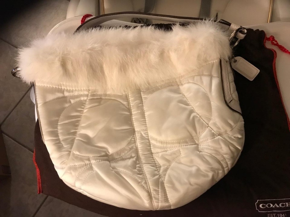 Authentic Coach handbag purse. Beautiful white satin with leather and rabbit fur trim. In EUC looks new. Barely used and kept in dust back which is also included. Smoke pet free home. All sales final