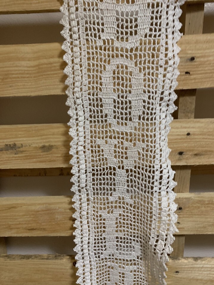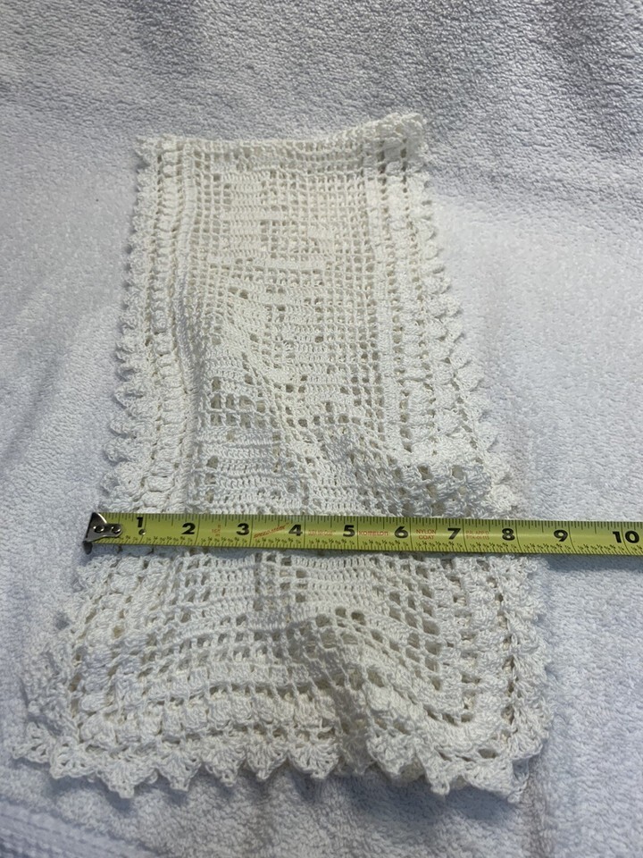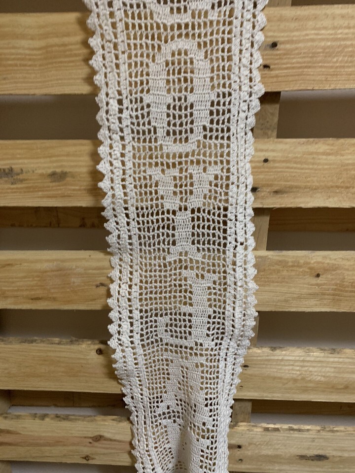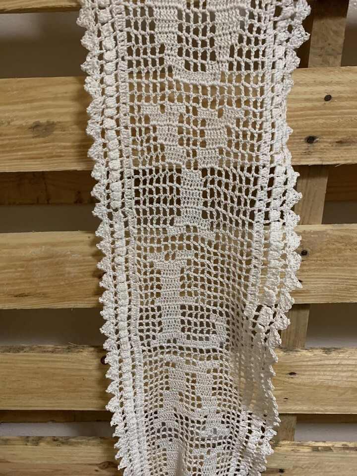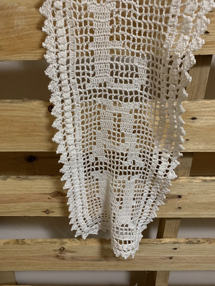 Doily was hand made into a table runner. Crocheted by hand. The lady name Boylan is on the runner. Measured length while doily was folded in half. Please see pictures for details and measurements.