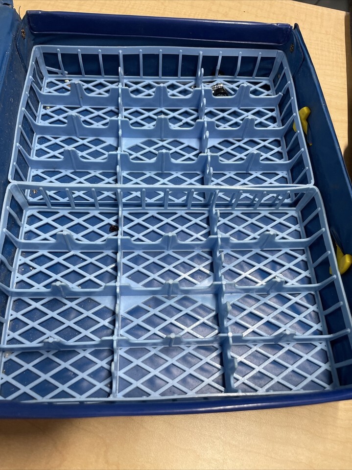 This case has had a lot of use! There is a crack on the front left bottom corner on the plastic. The plastic is peeling on the bottom. the Right Side is bent out of shape and is cracked. Inside is clean and has all four stacking trays! Please see pictures for condition details and measurements.
