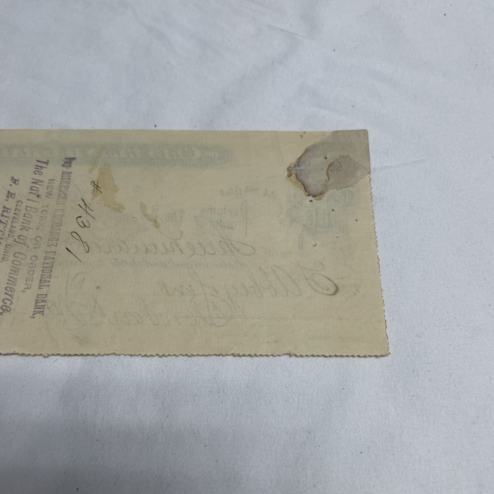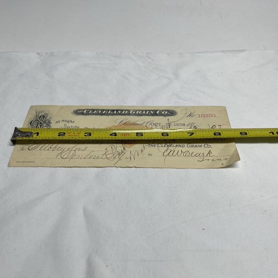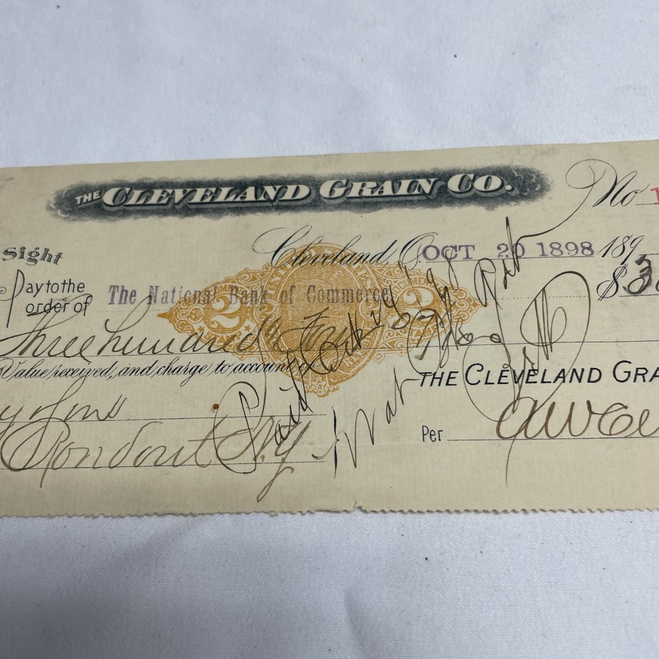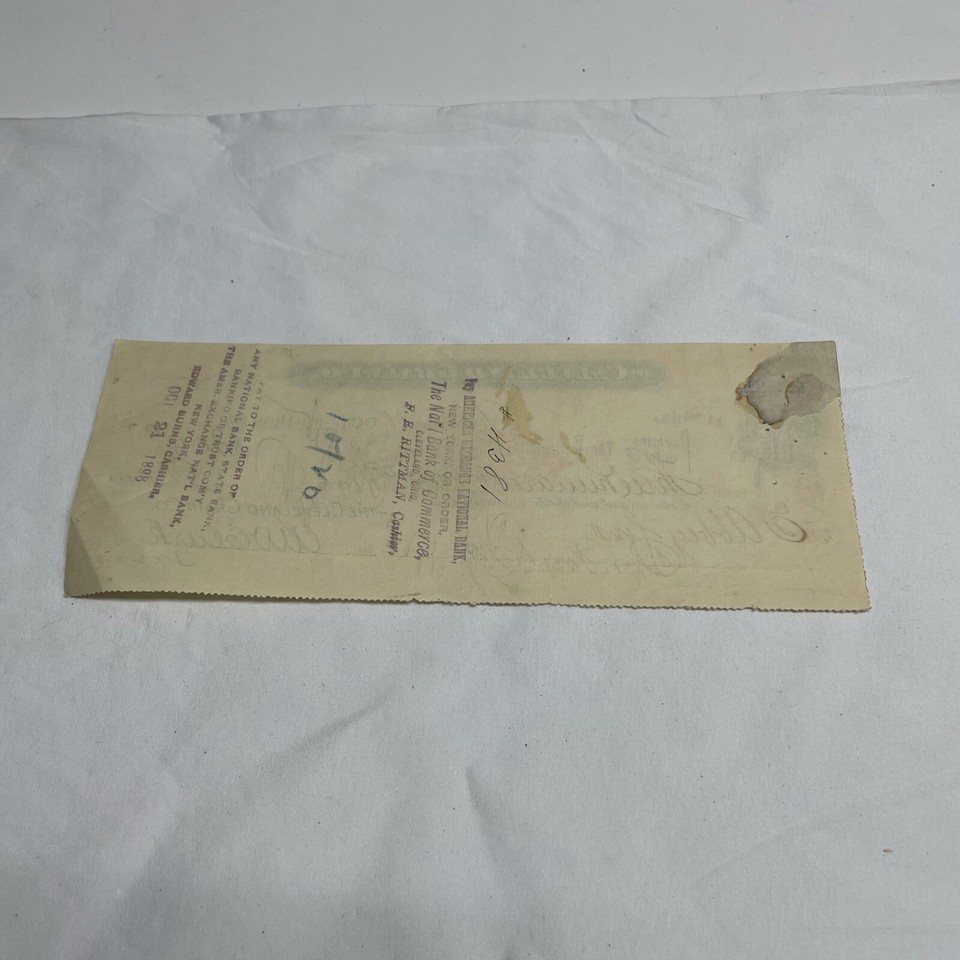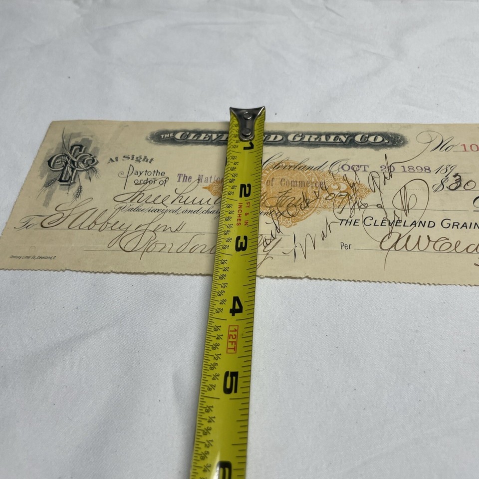 Good, displayed condition. Corner is creased over. Stamped October 20, 1898. Some yellowing and staining on the check. Please see pictures for condition details and measurements.