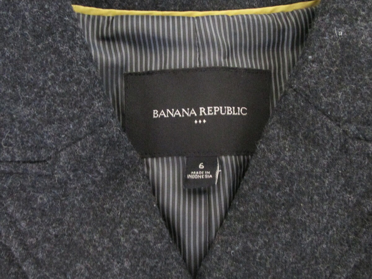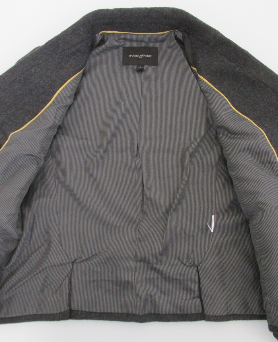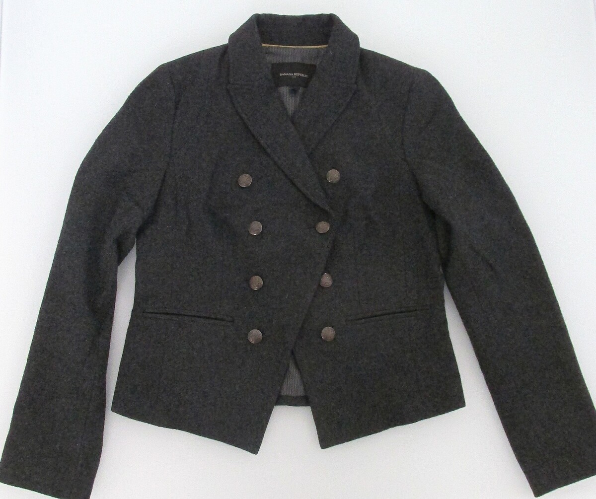 Description: Up for sale is a Banana Republic women's wool (fabric content label missing) double breasted blazer. This blazer is size 6. It is made of either all wool or wool blend fabric. It is charcoal gray in color. It has a double breasted front with metal buttons and 2 front accent pockets. The jacket features double rear vents. This jacket is in excellent condition.