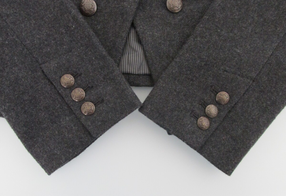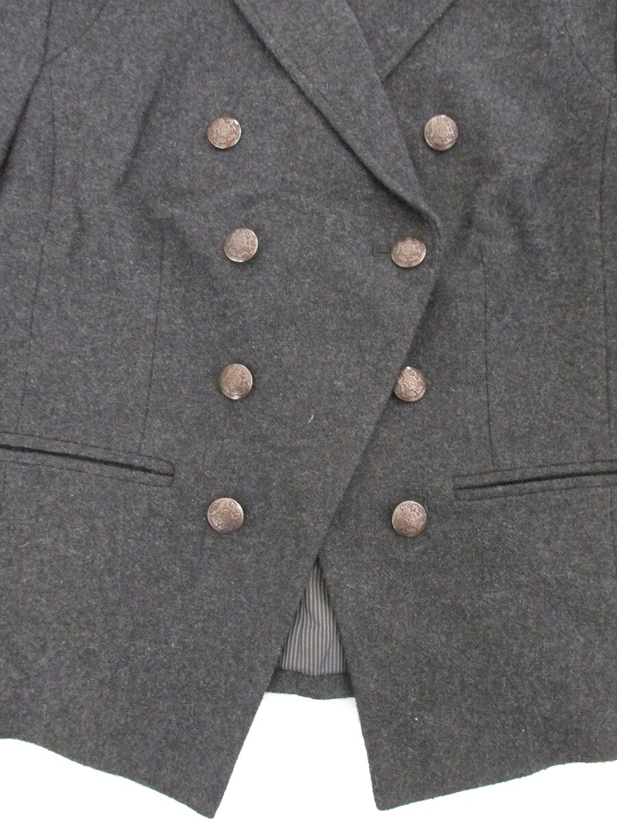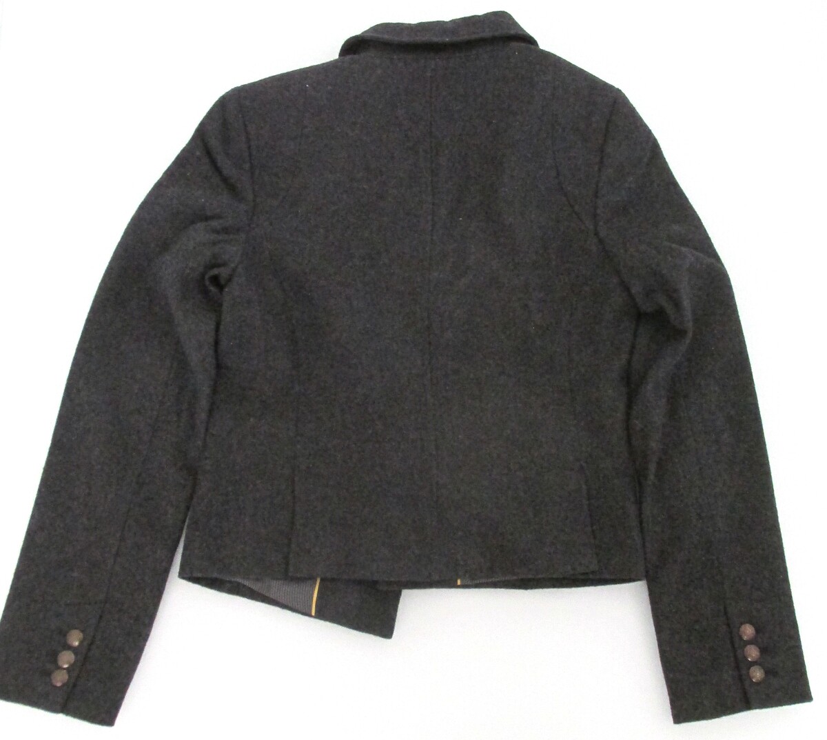 Description: Up for sale is a Banana Republic women's wool (fabric content label missing) double breasted blazer. This blazer is size 6. It is made of either all wool or wool blend fabric. It is charcoal gray in color. It has a double breasted front with metal buttons and 2 front accent pockets. The jacket features double rear vents. This jacket is in excellent condition.