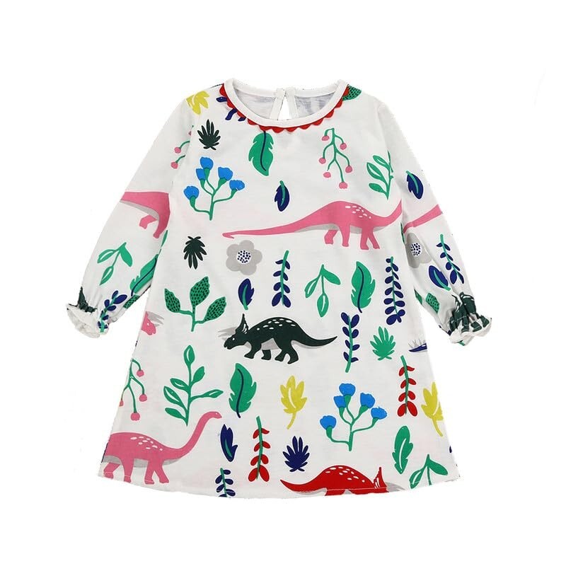 Adorable Cartoon Dinosaurs Pattern: Your little one will be captivated by the charming cartoon dinosaurs pattern, adding a playful and fun element to her outfit.