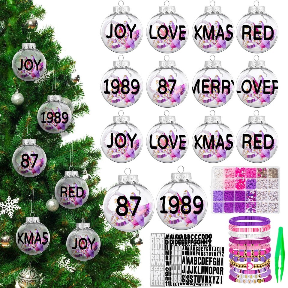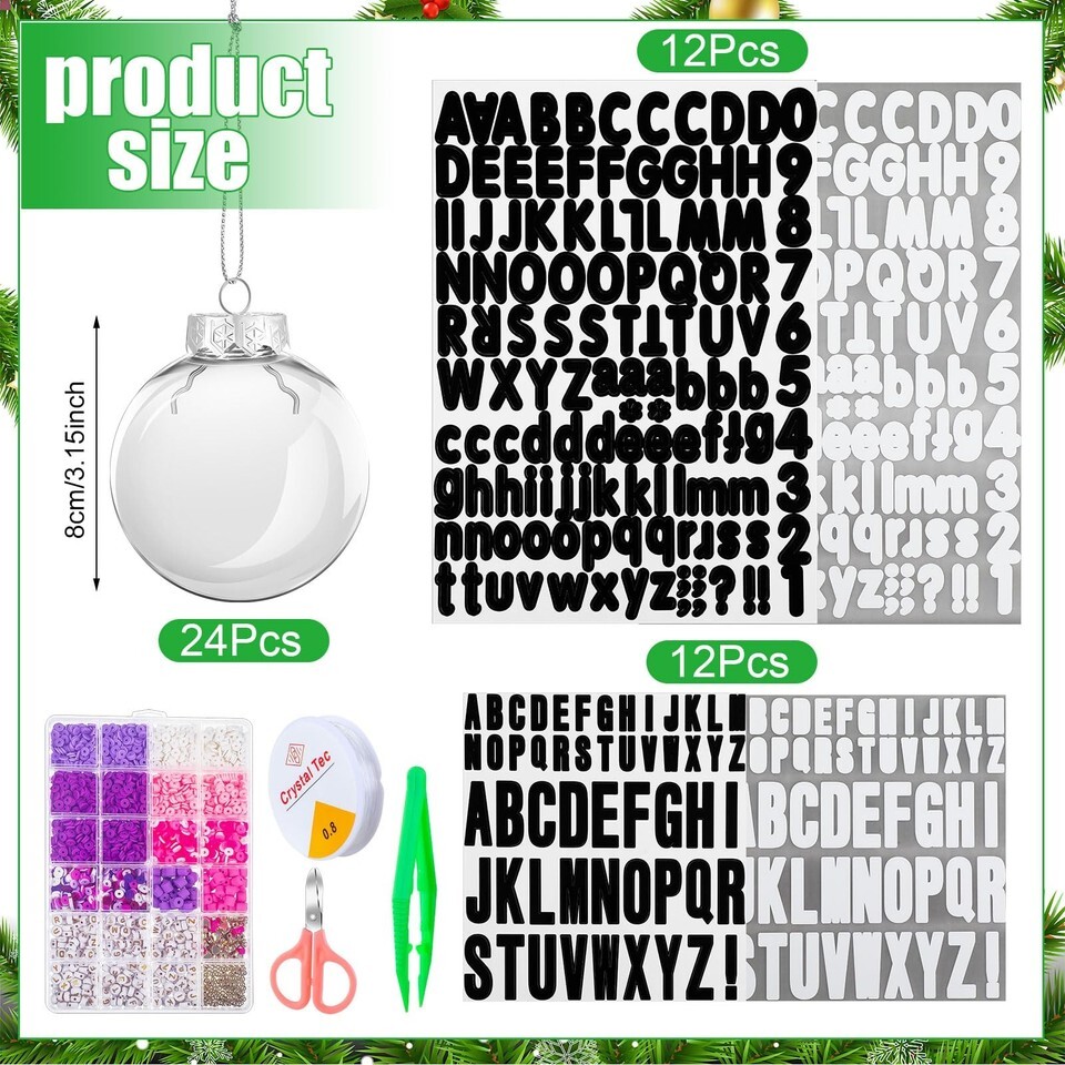 Features: Each ball in the Christmas ornament set stands out with its clear color, which provides a stunning visual effect. With a size of about 3.15 inches/8 cm, these plastic balls are just the right size to bring out the gleaming sparkle in your Christmas ensemble. This set, which includes 24 clear plastic fillable decorative balls, 24 stickers, and 2 DIY bracelet kits, provides an abundance of Christmas deck-up essentials creating a rich, festive atmosphere. Expect an easy and fulfilling ornament assembly experience this Christmas. Specifications: Material: Ball: PET and aluminum Stickers: vinyl Bracelet DIY kit: polymer clay Ball color: clear Ball size: about 3.15 inches/ 8 cm Package includes: 24 x Christmas decorations tree ball 24 x Stickers 2 Sets of friendship bracelet DIY kit Notes: Manual measurement, please allow slight errors on size. The color may exist a slight difference due to different screen displays. Small items included, please use carefully to avoid the risk of swallowing.