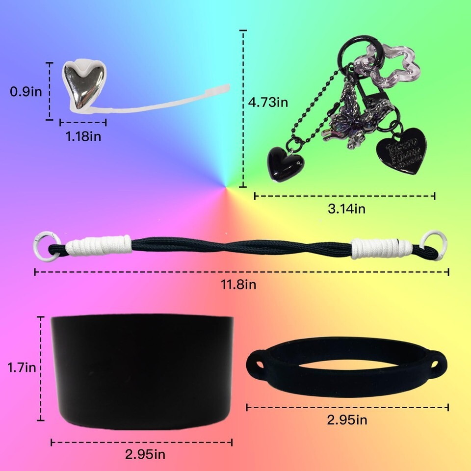 Package Contains This Stanley Cup Accessories Set contains 1pcs 0.4 Inch/10 MM Straw Cover Cap, 1pcs Water Bottle Handle Polyester Strap, 1pcs Chain Hanging Charms, 1pcs Silicone Boot and 3pcs Random Stickers Perfect design for Stanley 40 OZ Tumblers