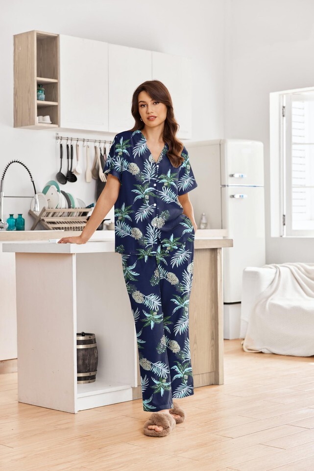 FEATURES: The 2 piece lounge set consists of a short sleeve shirt and long pants, featuring soft and lightweight fabric, notch collar, button down design, two pockets, stylish resort print, loose fit loungewear.